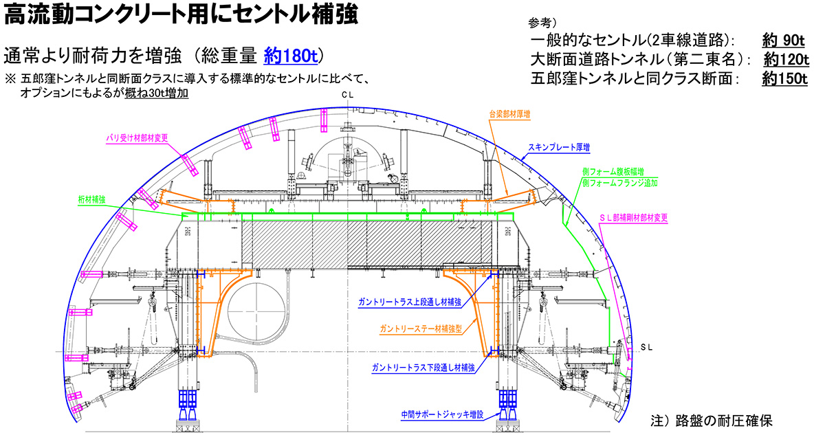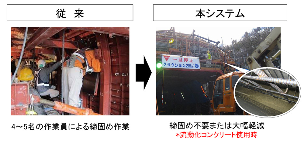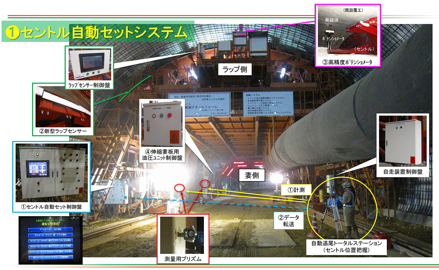 同セントルは、①セントル自動セットシステムと、②コンクリート打設自動化システム、③セントル脱型移動システムから構成されている。これらを用いることで、通常6人で行うトンネルの覆工コンクリートの作業を2人まで省人化することを目的としたもの。機械の自動化だけでなく、覆工コンクリートに高流動コンクリートを使用することでバイブレータ作業を省力化することも行っている。