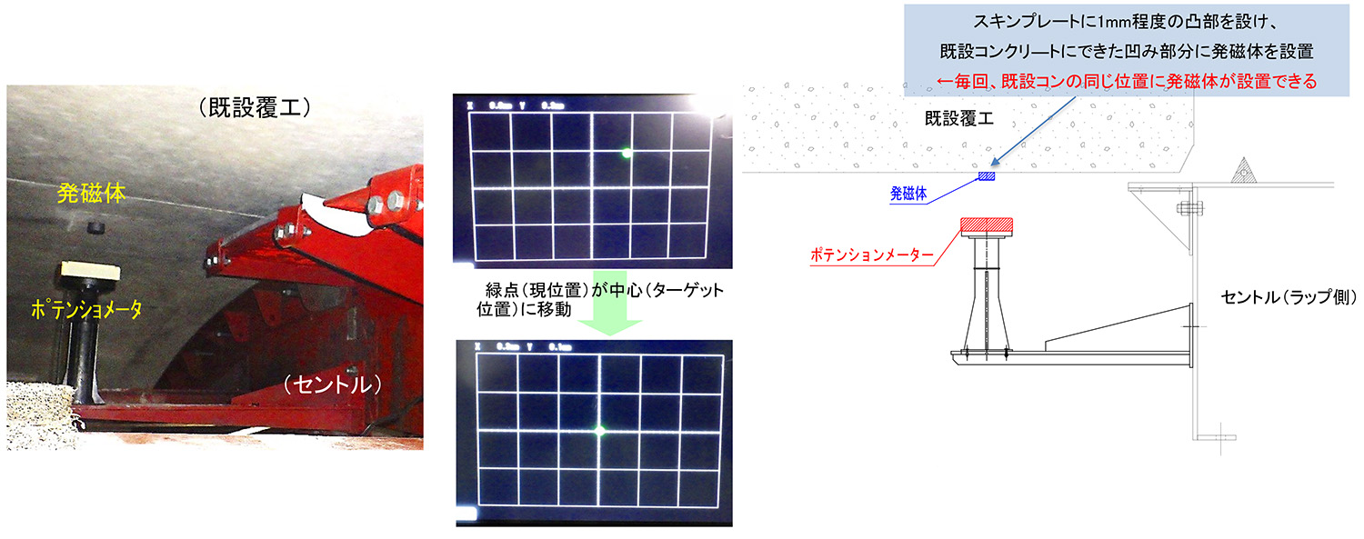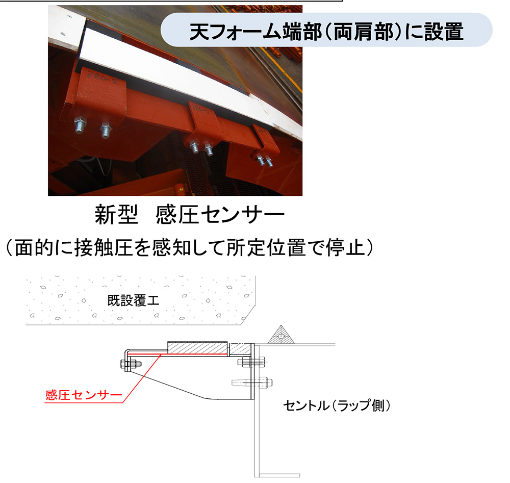 ①は、自動追尾トータルステーション(TS)でセントル位置を測定し、設計位置と実測位置の差分値をセントル制御盤に自動転送する。その後、制御盤からの指令で、天端や側フォームなどを設計位置に自動で移動してセットを完了することができる。先行打設した覆工コンクリートのラップ箇所は面的に接触圧を感知して、所定位置で自動停止できる新型接触式センサー(右図)を用いる。また、天端部には高精度ポテンションメーター(可変抵抗器)を利用した位置誘導装置(下写真)により、従来方法と同等の精度で迅速なセットを可能にしたものだ。