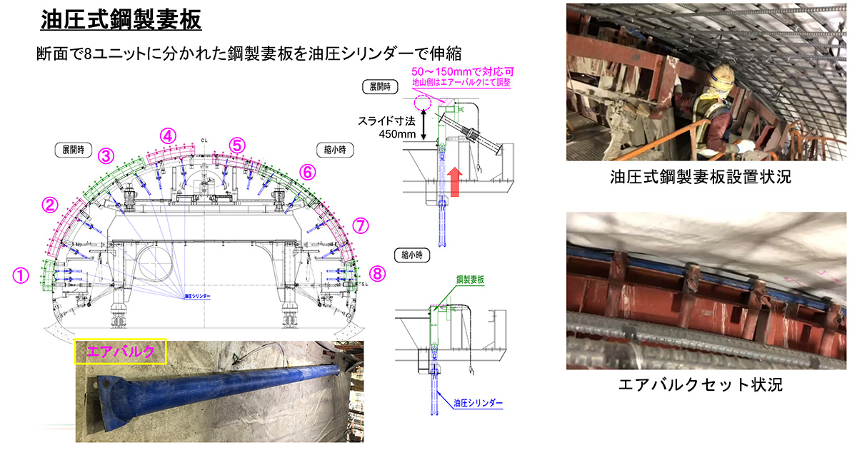 さらに型枠は伸縮妻板(スライド式矢板)を使用している。これは、断面で8ユニットに分かれた鋼製妻板を油圧シリンダーで伸縮させるもの。地山側は凹凸があるため、それに対応して隙間を埋めるためにエアバルクまたは硬質スポンジを使って対応している。