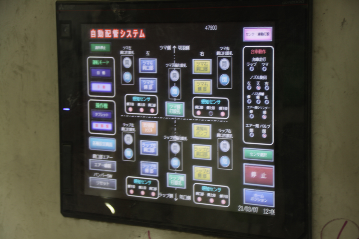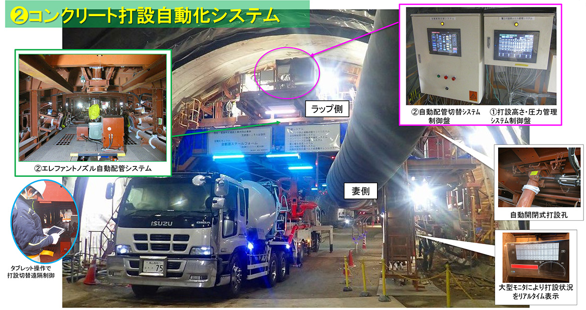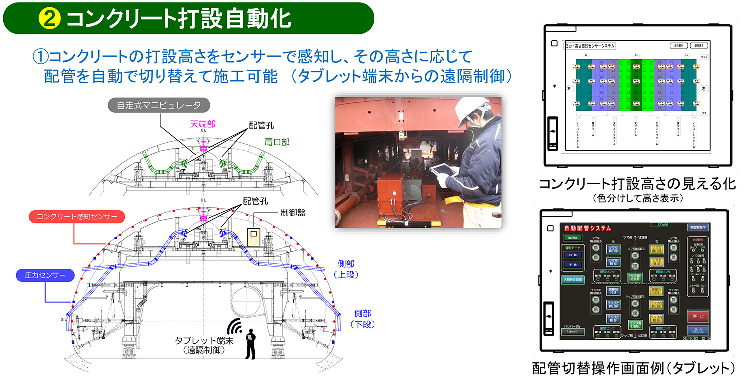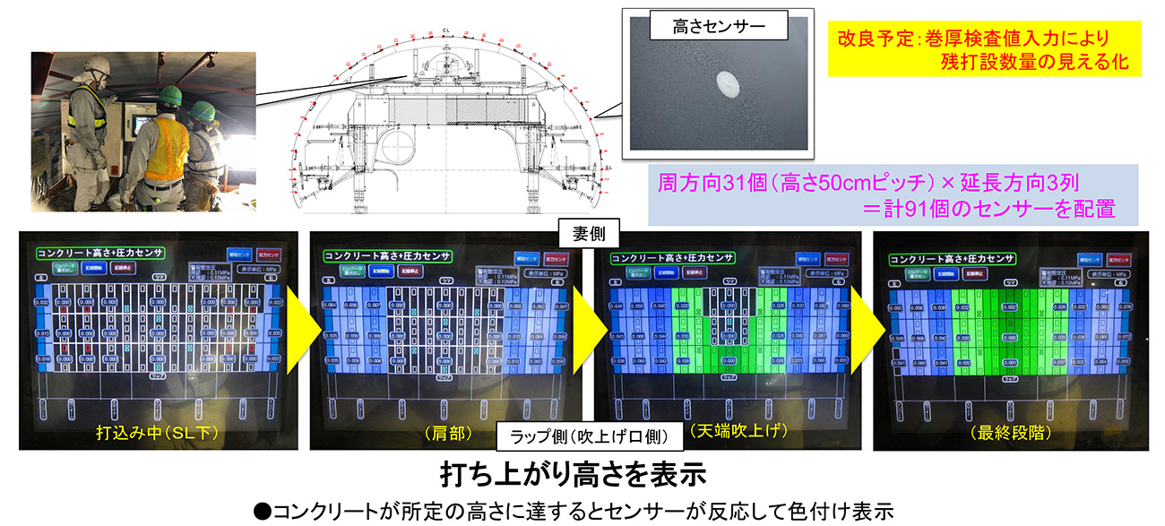 ②は、コンクリートの打設高さをセンサーで感知し、その高さに応じて配管を自動に切り替えて施工するものである。操作はタブレット端末から遠隔制御できる。同トンネルのコンクリートは冒頭に示したように配筋されており、厚さは従来トンネルより50~100mmも厚い400~450mmに達する。その打設高を確認するため、周方向に31個(高さ50cmピッチ)、延長方向に3列、計91個のセンサを配置しており、コンクリートが所定の高さに達するとセンサーが反応して色付け表示され、進捗状況が視覚的に確認できる。同様に型枠に作用する圧力についても周方向9個所×延長方向3列、計27個のセンサーを配置し、型枠へ作用する側圧をリアルタイムで表示できるようにしている。