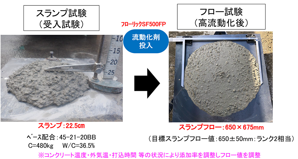 コンクリートは9割の区間で中流動タイプを使用したが、約1割において高流動タイプも採用した。高流動コンクリートの最大の特徴はその省人化率である。中流動は打設時の締固めのため棒状バイブを使わねばならず、肩部に打ちあがるまでたくさんの人手を必要とする。しかし、高流動タイプは、その流動性から鉄筋があってもきちんとコンクリートが回り込んでいき、棒状バイブで突く必要がなく、型枠バイブレータのみの自動締固めで品質を確保できる。そのため、打設時の作業効率は従来比56%までの省人化を達成することができた。