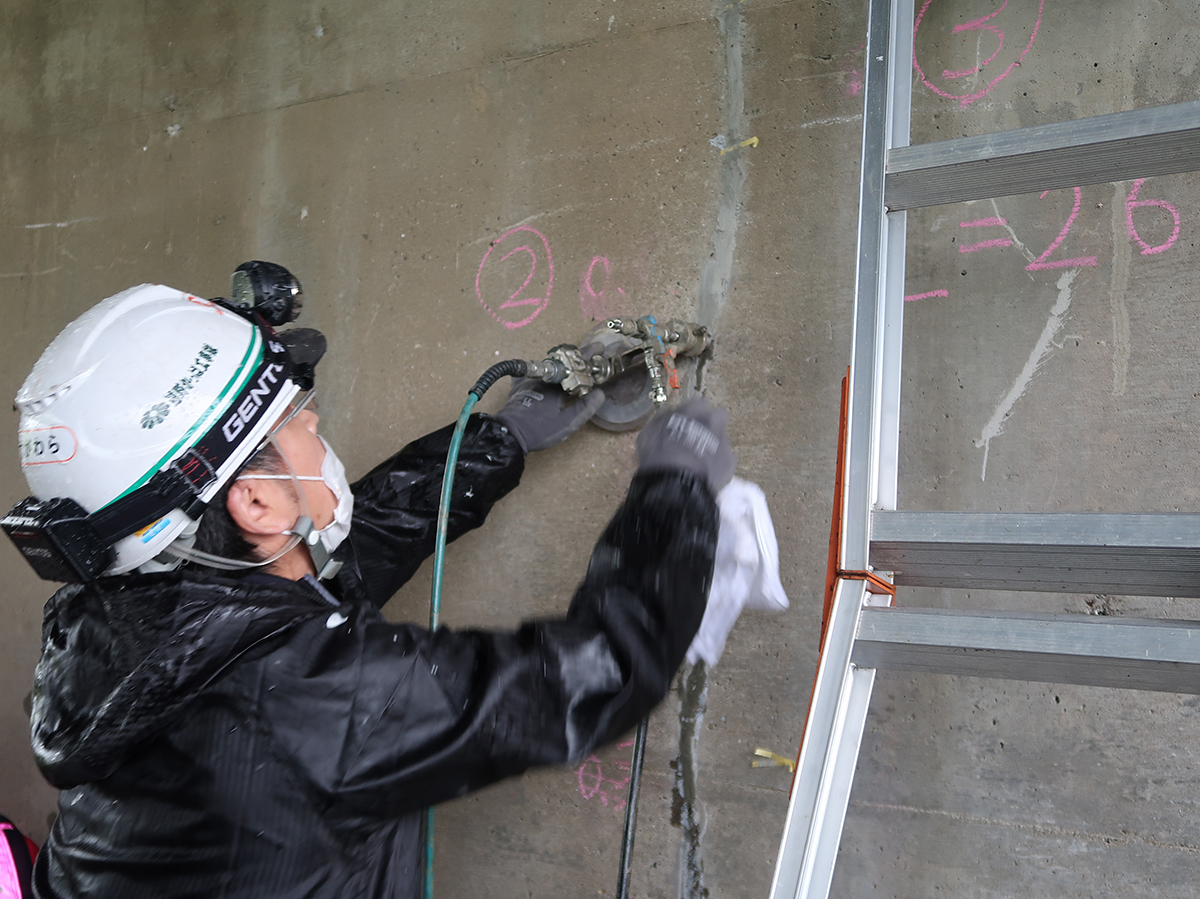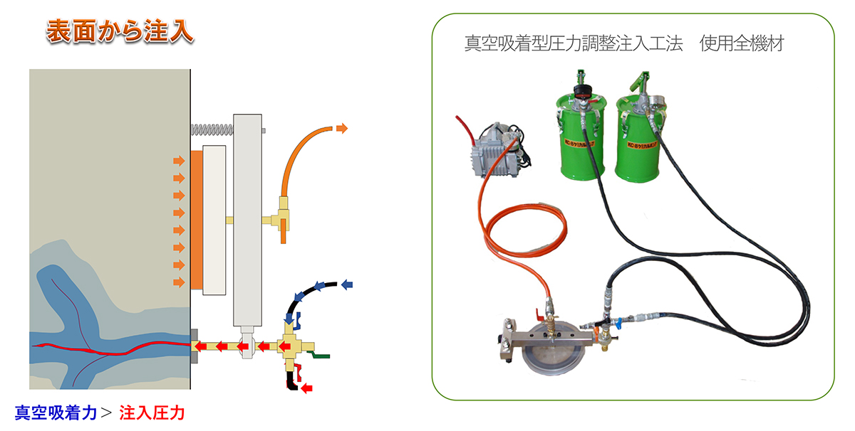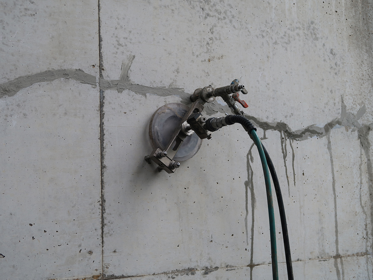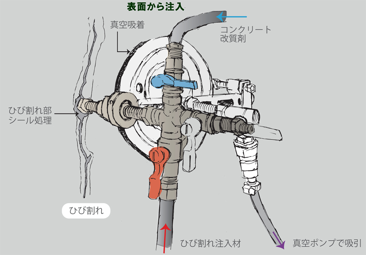 施工には、コンクリートを削孔する必要がなく表面から注入できる真空吸着型の注入機を用いた。シール材はどのような材料でも使用可能だが、今回は無機系の急結セメントを使用。同材料は、ハケのみできれいに仕上げることができるので、制約の多い箇所や施工時間が限られている場合には効果的である。