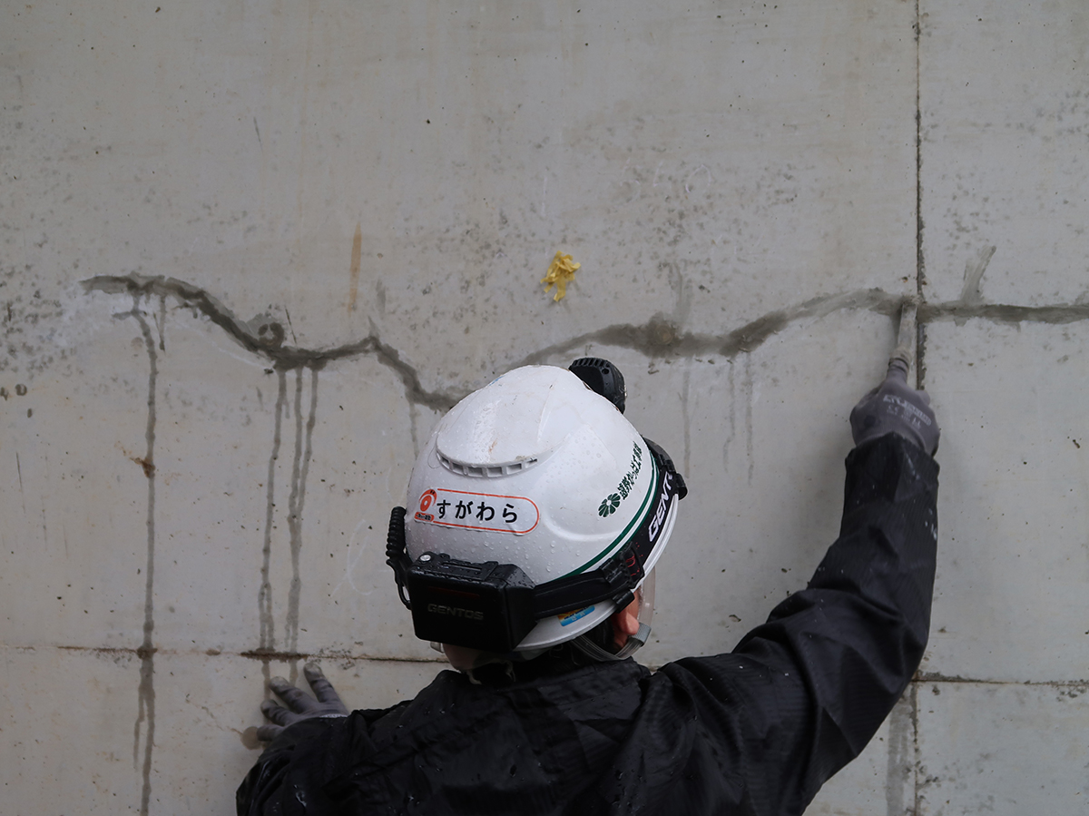 ひび割れには補修痕があり、「おそらく無機系の材料を低圧注入工法で注入したことが推察される」(佐々木栄洋氏)が、補修したにもかかわらず、ひび割れが発生して再劣化していた。「表面は開いているが、内部が詰まっているようなひび割れは、奥に材料を注入することが難しい」(同)という。