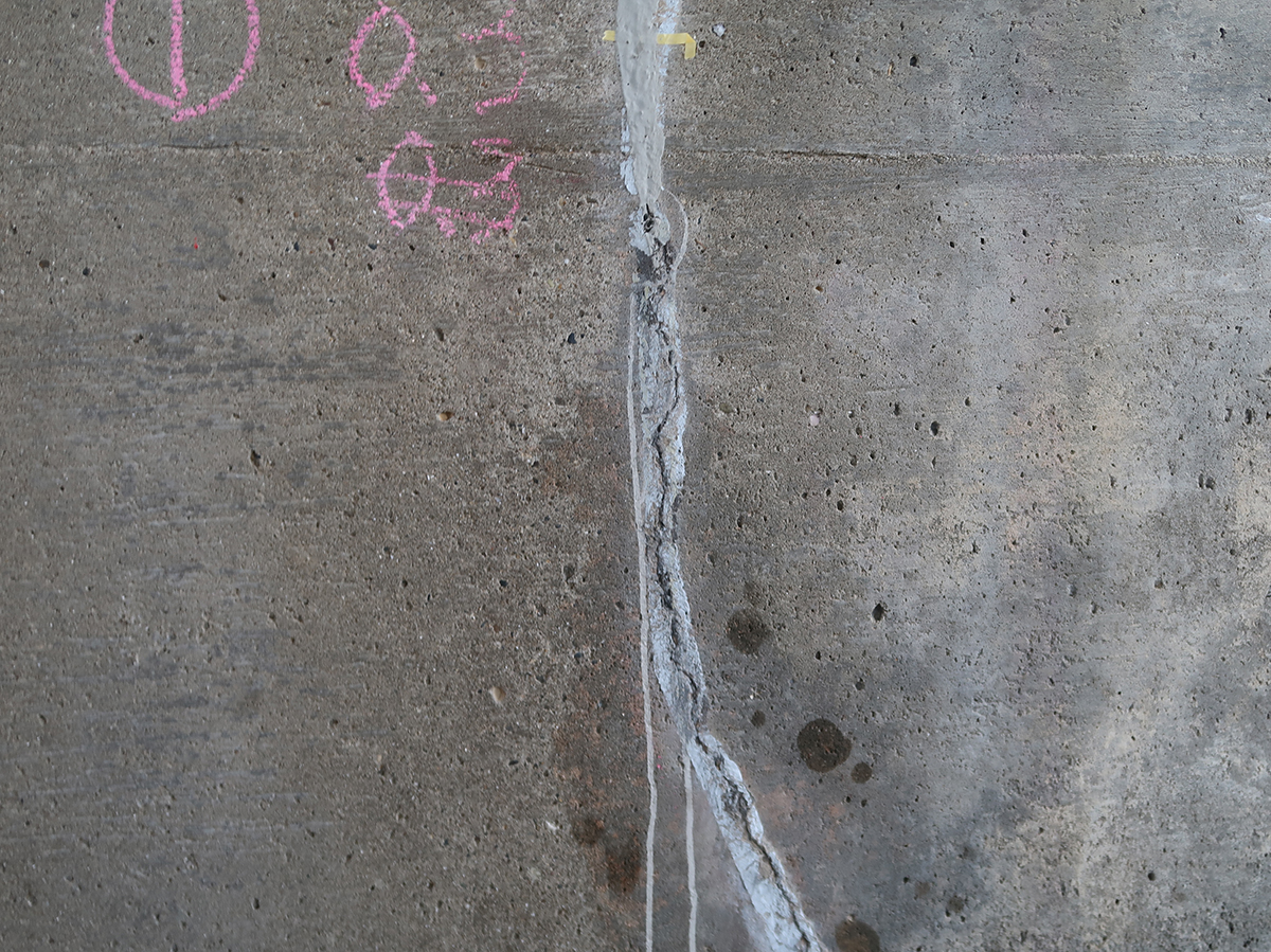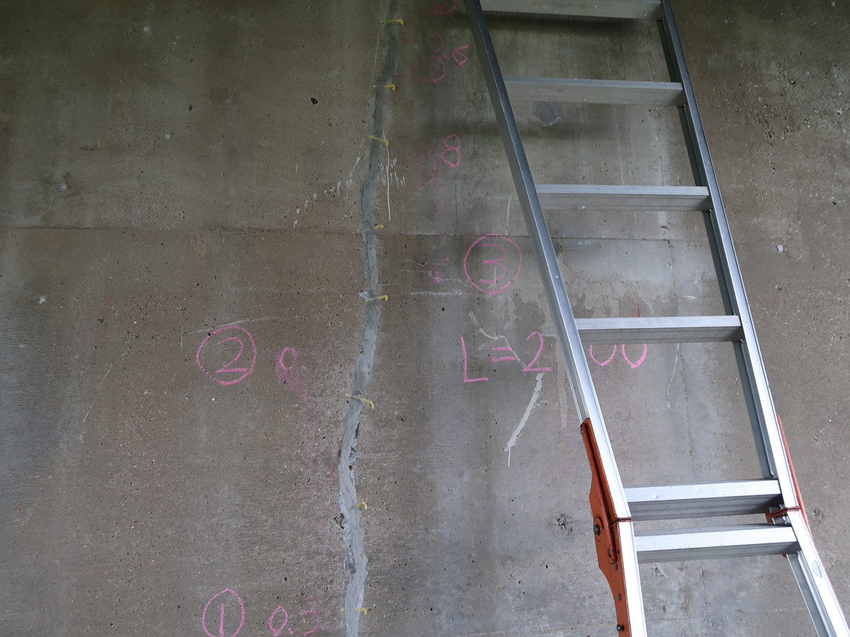 幅が下部0.3mm、上部0.5~0.8mmの鉛直方向ひび割れを補修