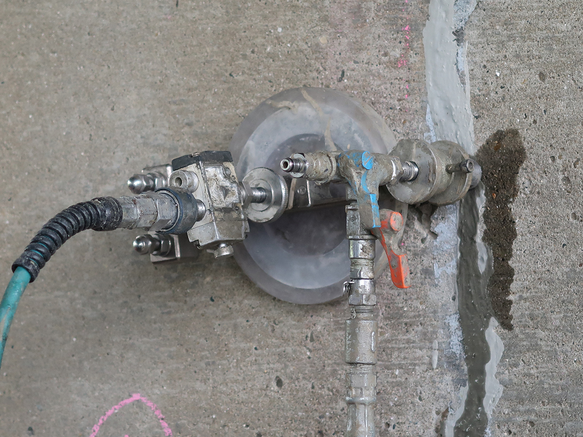 注入では開始時に圧力を上げることにより、その圧力で材料がひび割れ内部に流れていき、徐々に圧力が下がれば流れなくなるので加圧することを繰り返す。流れにくいボトルネックのような箇所では、圧力を高めることで対応する。その判断は、注入機に接続されたポンプを押している作業員が、注入圧力計を見ながら行っている。圧力は低圧注入工法の0.4MPaをひとつの目安としており、材料が流れていないと判断できれば中圧域の1MPaを目標に圧力を変化させながら、流れ方を確認していくことになる。なお、同工法の最大圧力は5MPaだ。