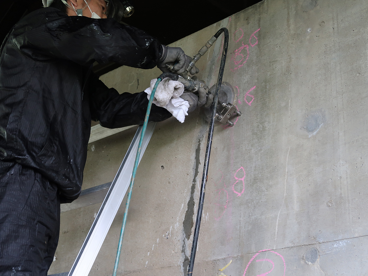 シール材を塗布していない表面に注入材が流れ出てきたら注入完了となる。現場では注入口の下側だけではなく、上側にも注入材が流れて出ていた箇所があった。注入状況によっては、すべての注入口から行うのではなく、1箇所飛ばして施工することもあるという。施工は10分程度で完了した。