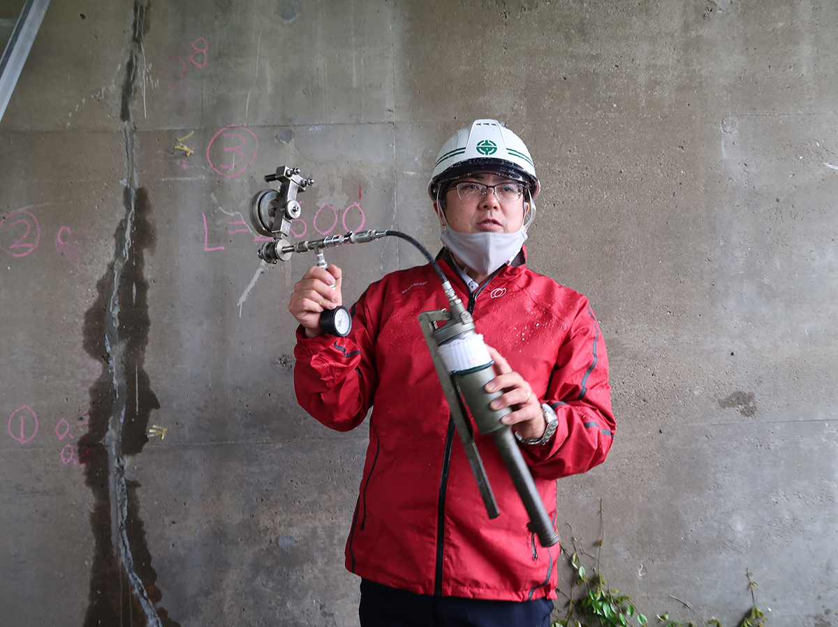 エポキシ樹脂材料の注入例と注入機。注入機を持っているのは、栄組の佐々木栄洋代表取締役