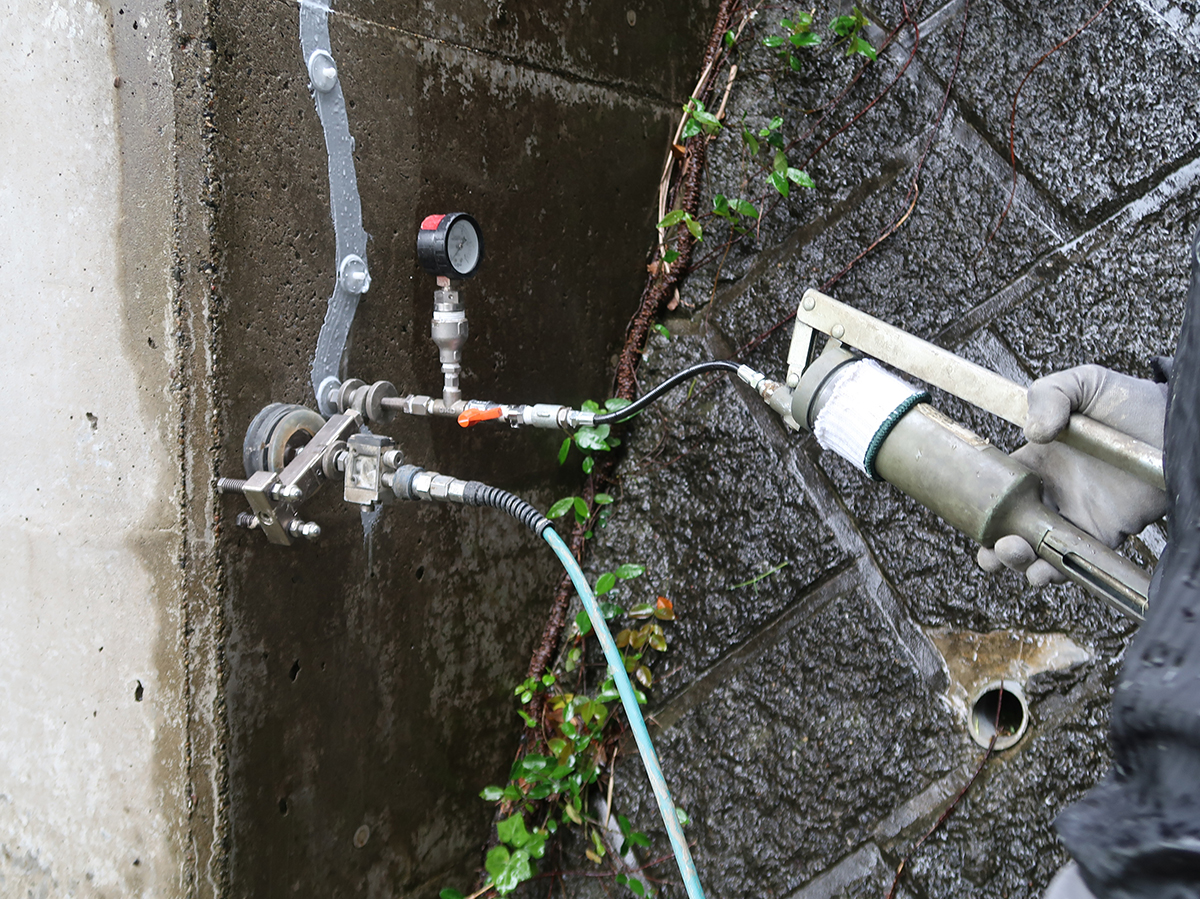 下部から上部へ向けて片押しで注入していく。注入材が表面に流れ出てきたら注入完了