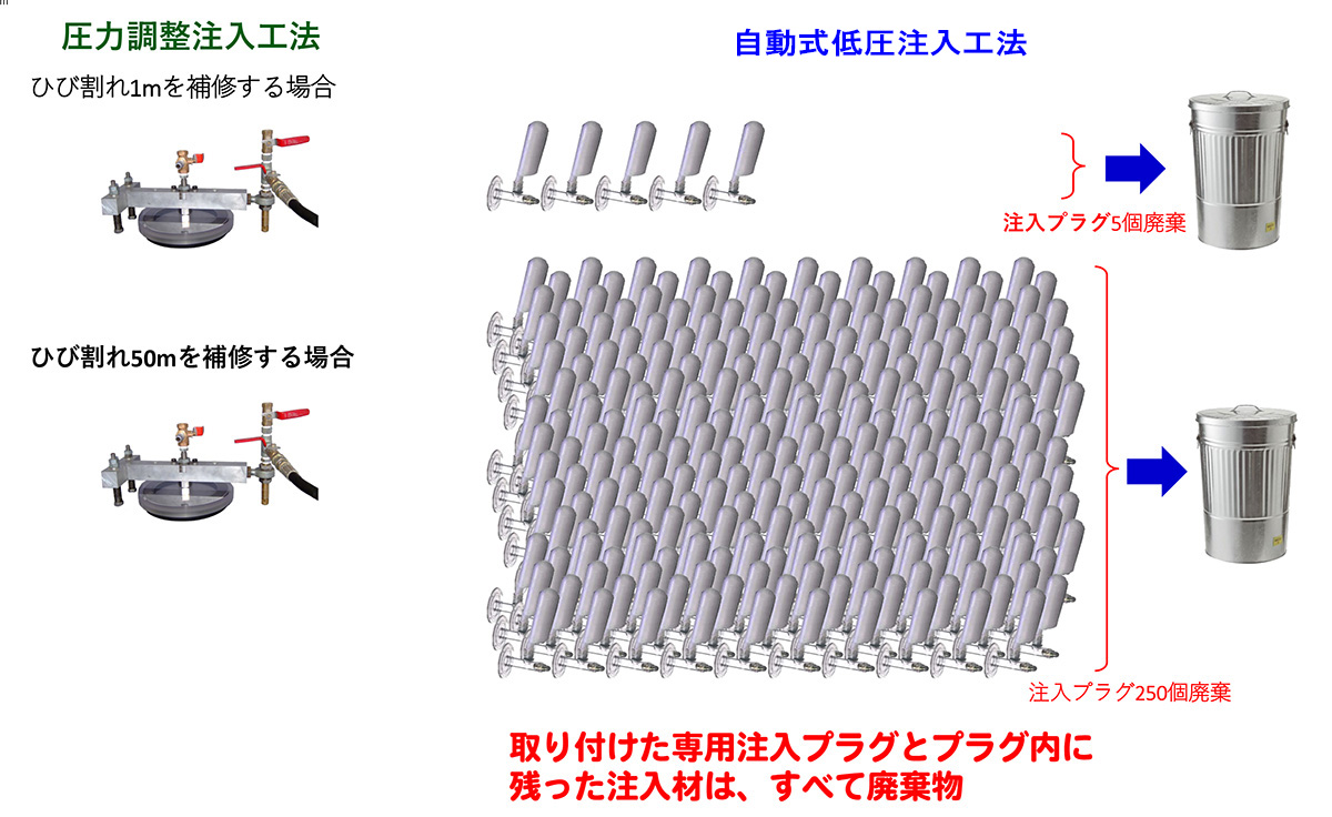 同工法について、佐々木栄洋氏は「装置を見ると高圧注入だと思われる方が多いが、現場では低圧の領域で終わることのほうが多い。高い圧力をかける注入工法ではなく、ひび割れの中に材料を確実に充填させることが目的で、それに適した圧力で注入することが重要。そのため、圧力調整注入工法という名称にしている」と説明を行った。
