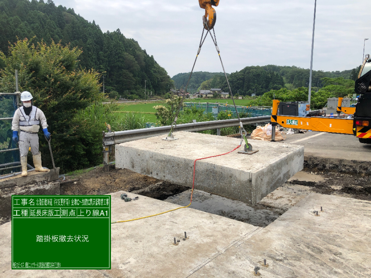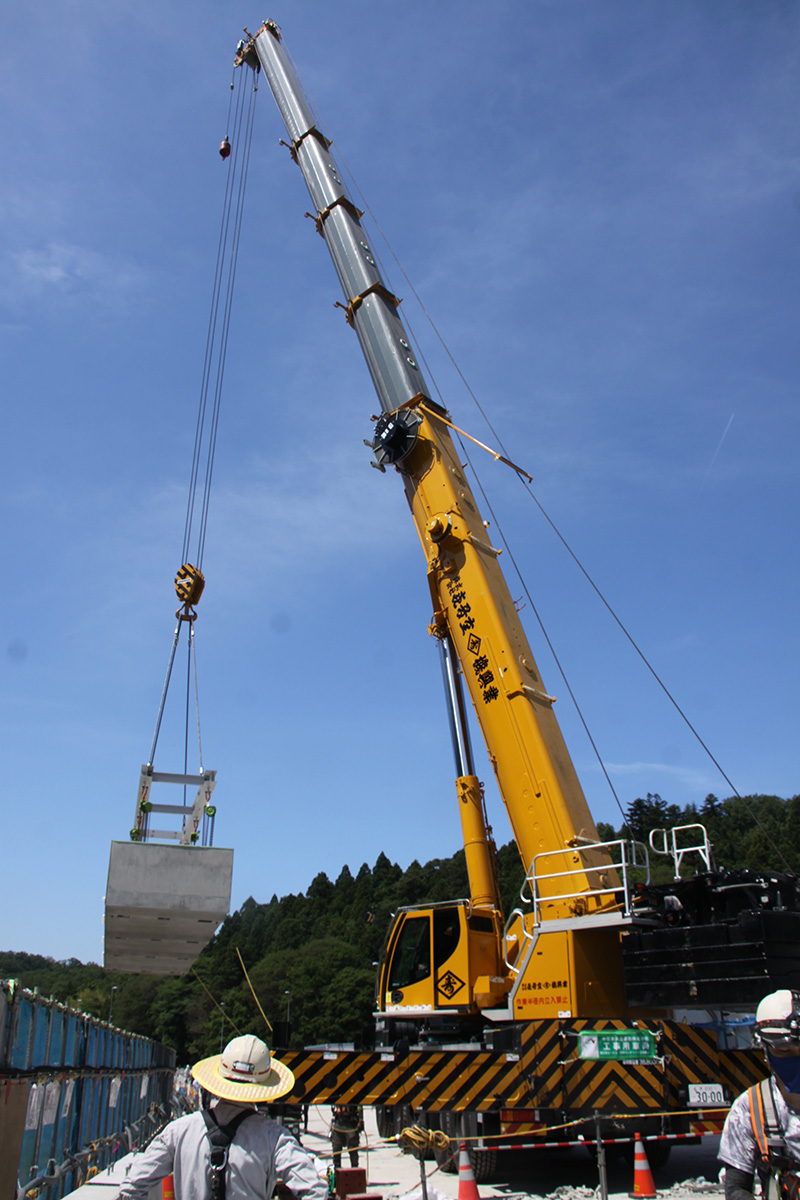 プレキャストPC床版の架設は、午前8~10時の約2時間強で前日撤去した部分に施工する。架設パネルは標準版で2,350mm×11,150mm。重量は標準版で18.3tとなっており、壁高欄がある分既設パネルより重くなっている。床版厚は標準版が210mmで、定着突起部は、210mmに突起部のみ200mmを加えた厚さとなっている。