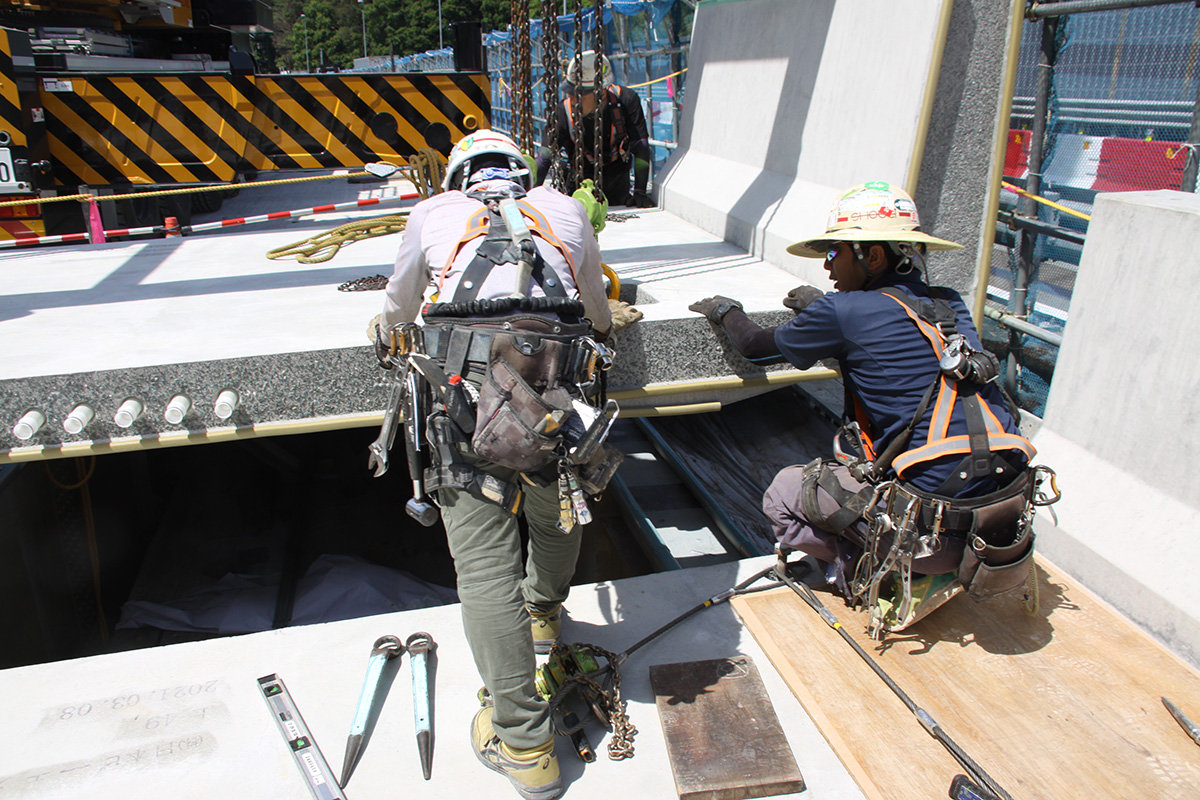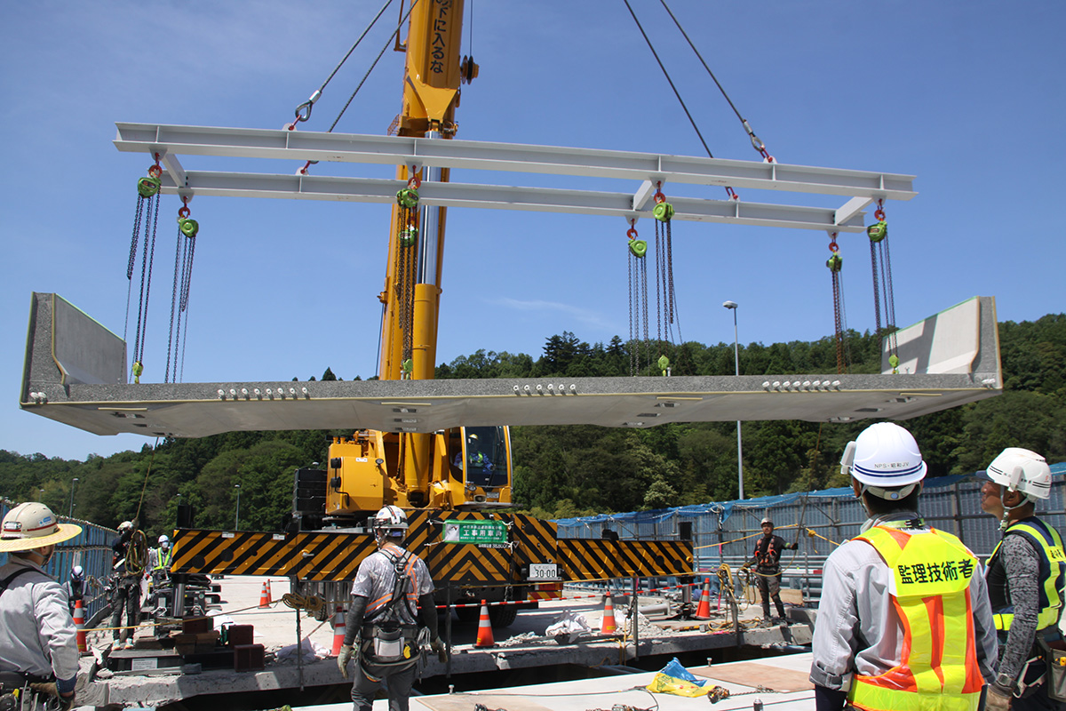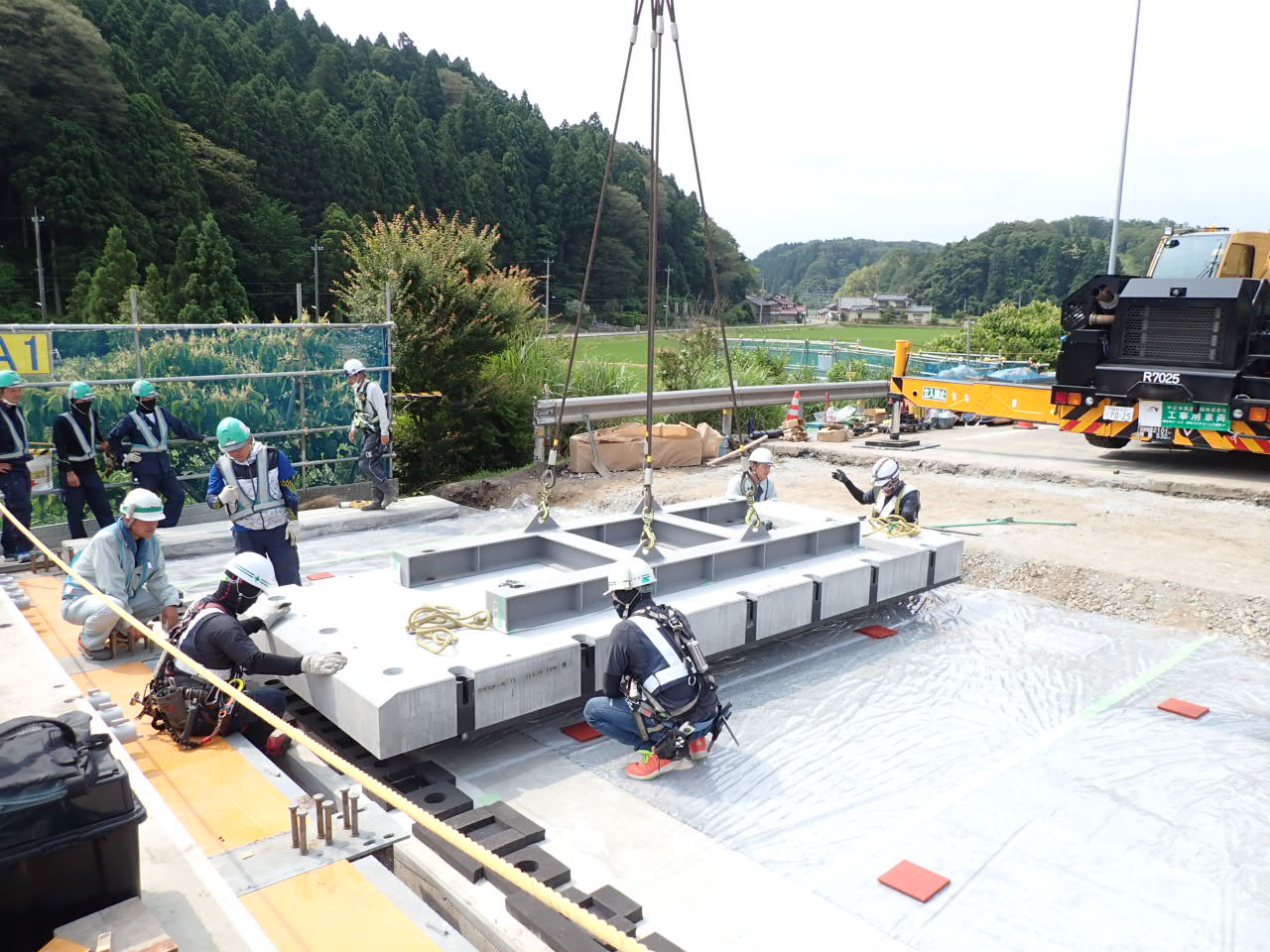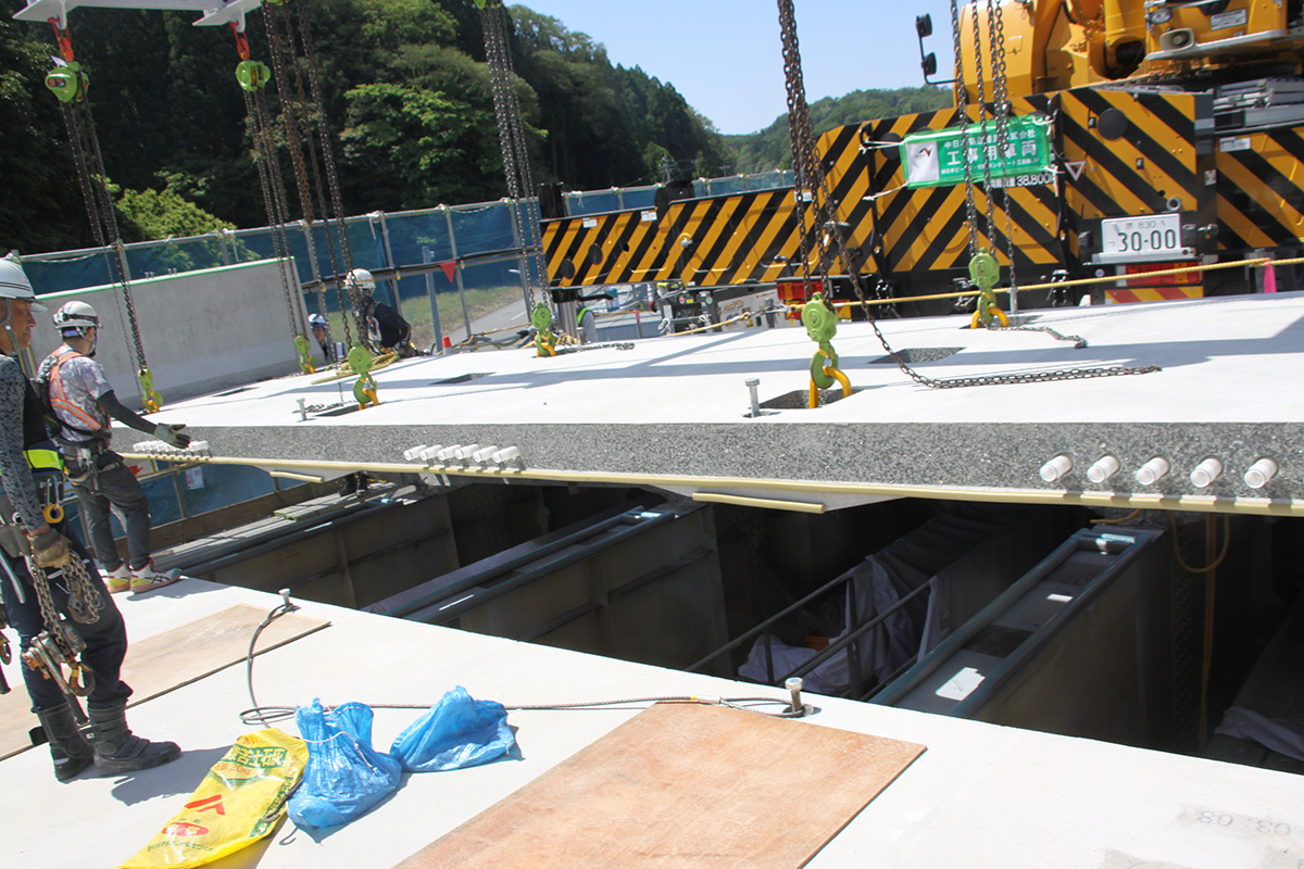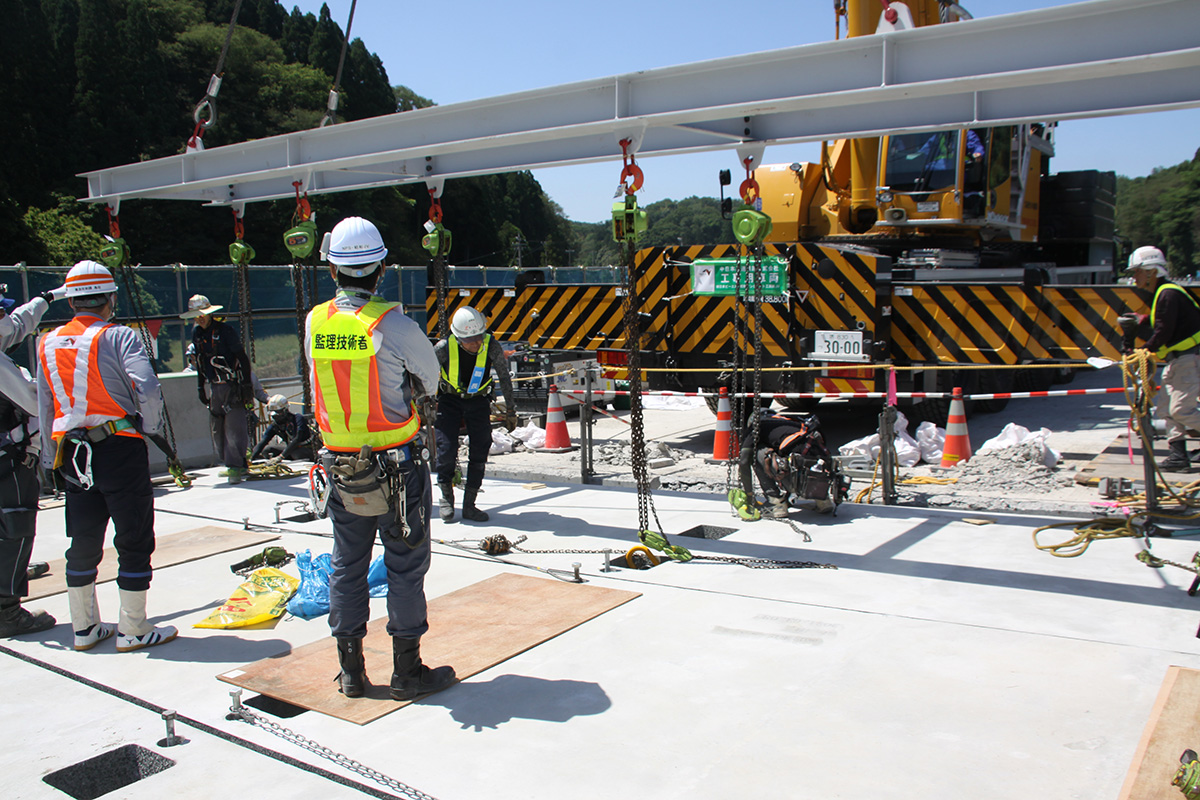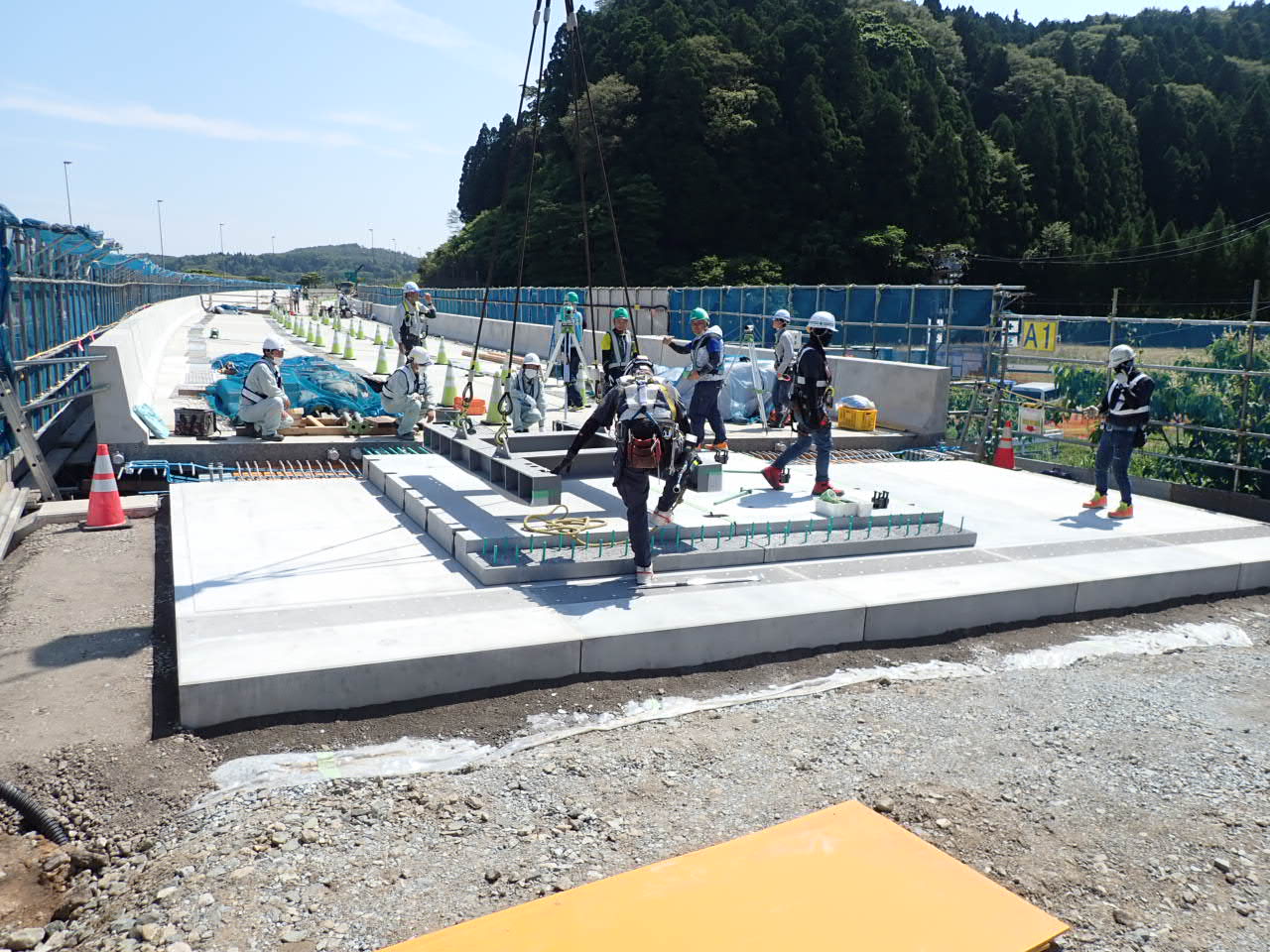 元請は日本ピーエス・昭和コンクリート工業JV(詳細設計も同JV)。一次下請は、喜多重機興業(クレーン)、コンクリートコーリング(カッター)、辻広組(防水・舗装)、信栄工業(PC工事)、エブリ(塗装)。
