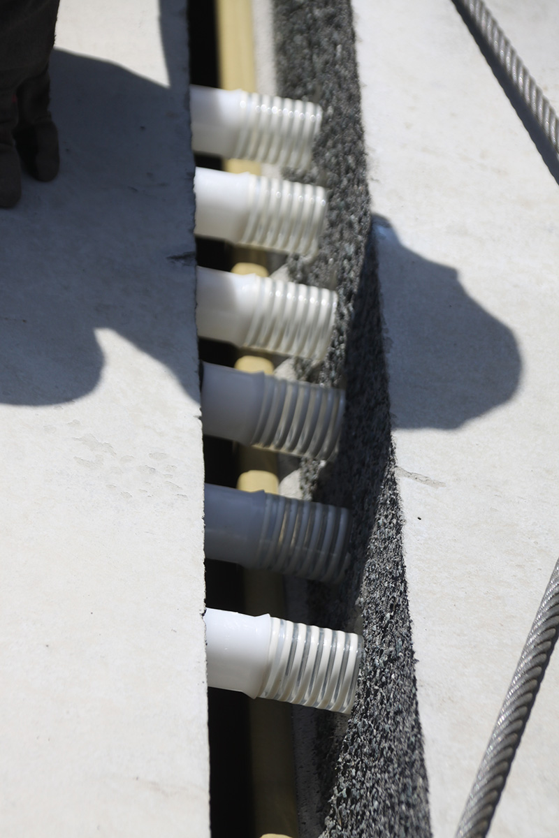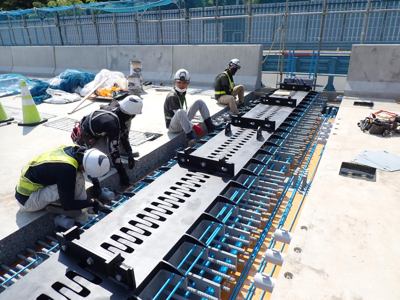 プレキャストPC床版パネルの架設完了後は、目地部のモルタル打設(61箇所)、縦締め緊張およびグラウトを行う。縦締め緊張に用いるPCケーブルの数は定着突起版付近(主に橋脚支点付近たすき掛け部)で26本、標準版でも13本配置している。