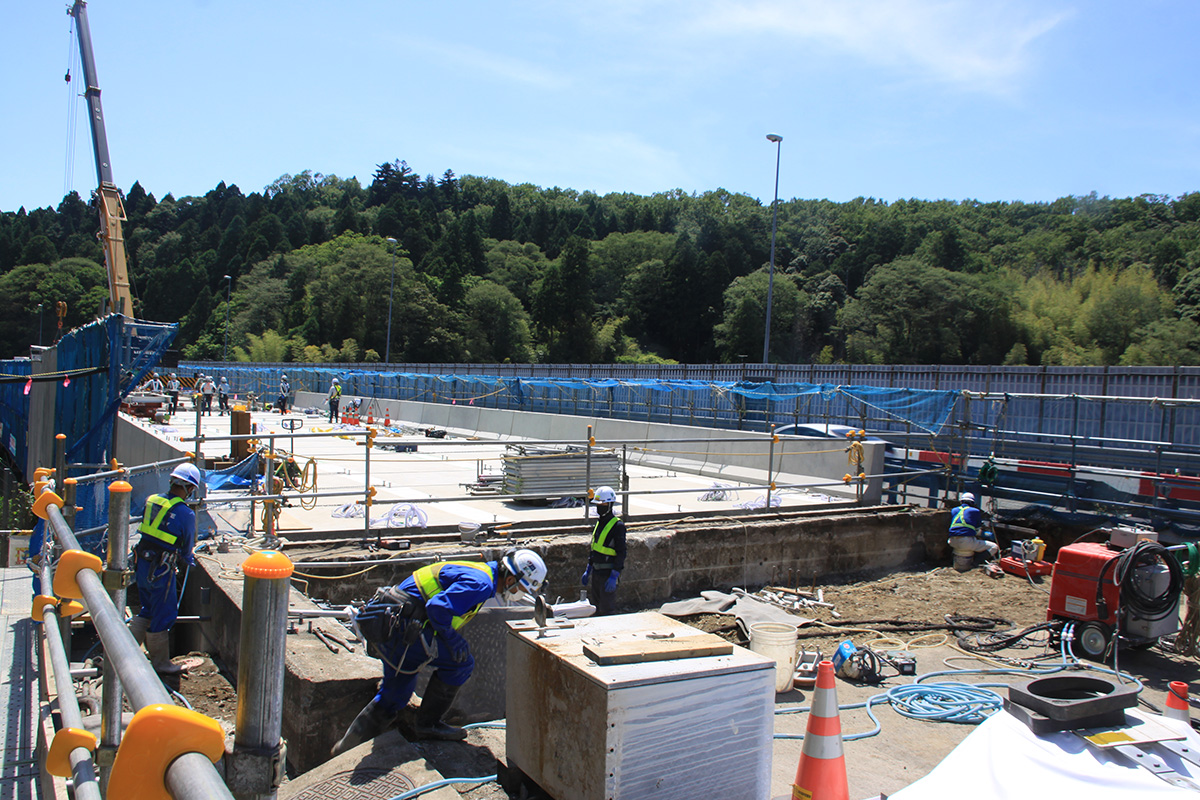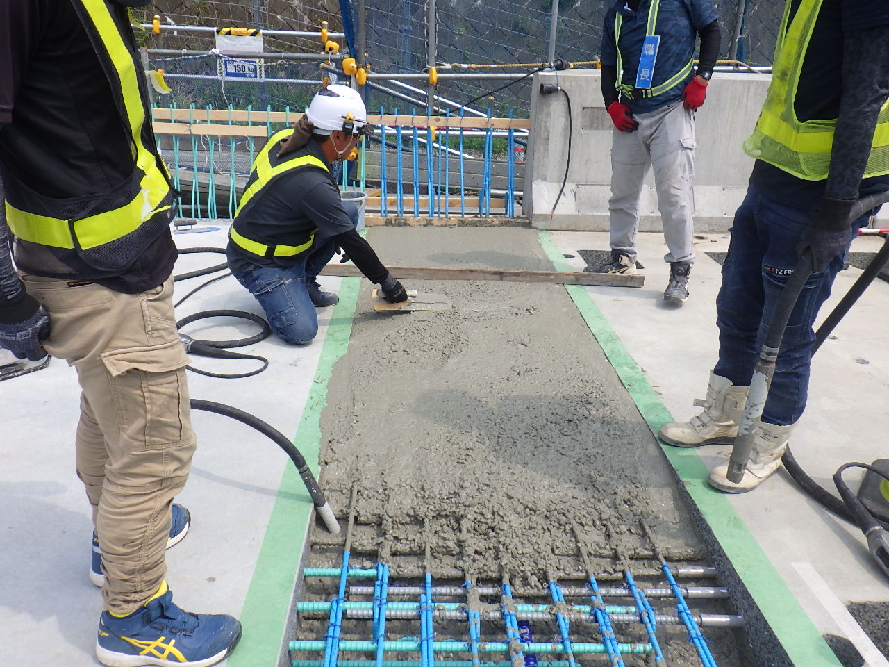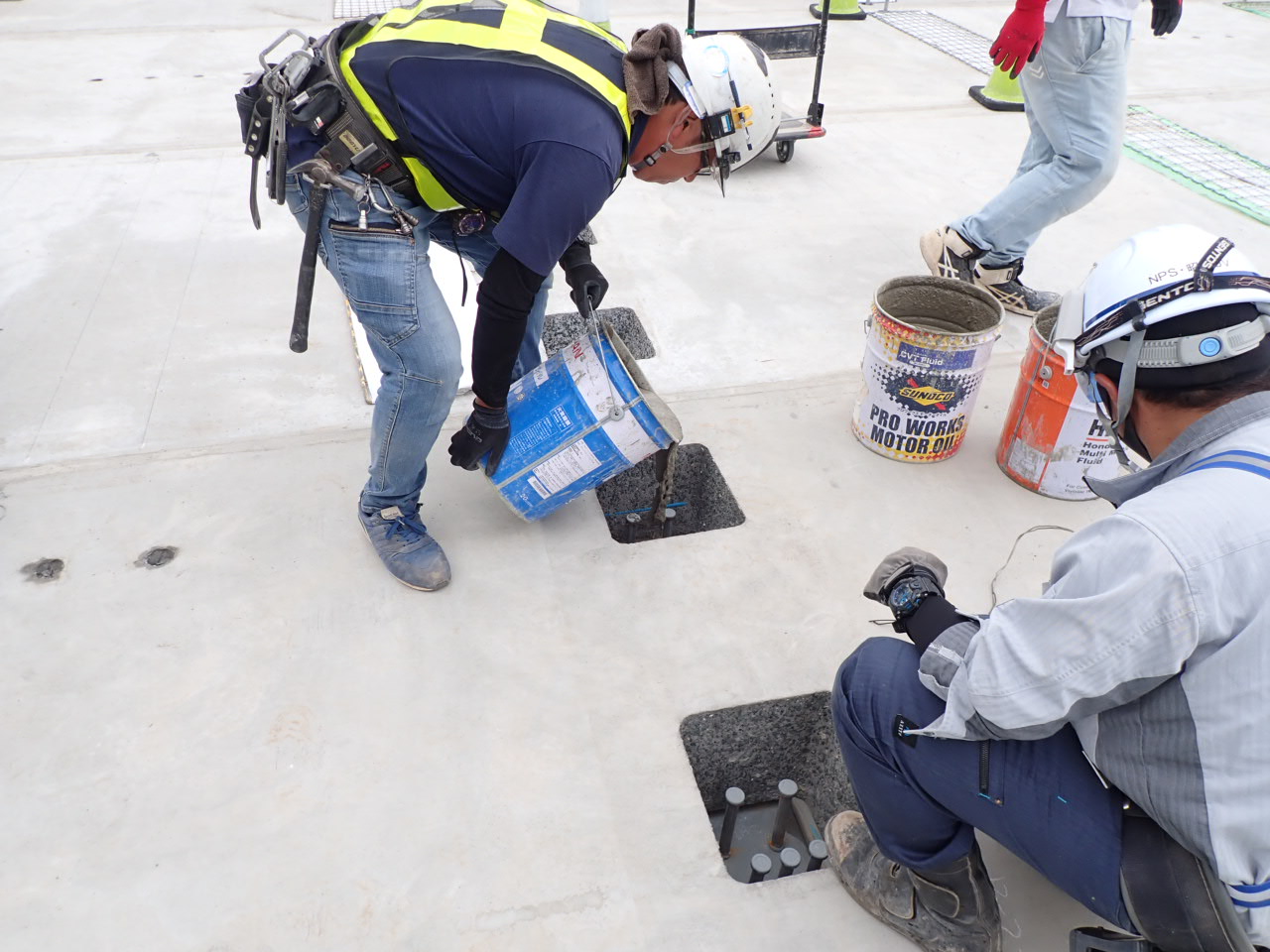 また、目地部の耐久性向上を目的とし充填材には収縮率が少ないポリマーセメントモルタル「Denka スプリードGV TYPE-P」を採用した。その後、スタッドを溶植し、版下モルタルとジベル孔のコンクリート打設により桁と床版を一体化した(右上写真)。