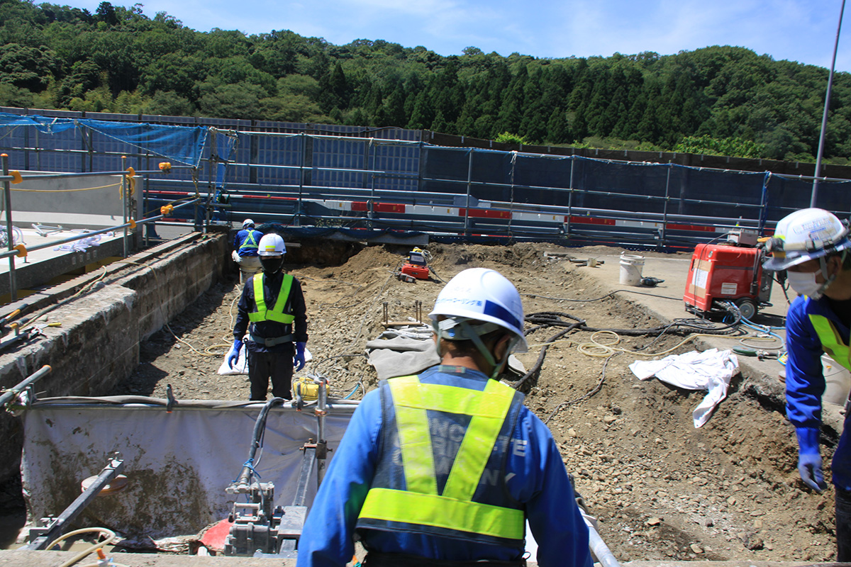 踏掛版撤去状況(左写真)/延長床版を設置予定の端部掘削(中、右写真、井手迫瑞樹撮影)