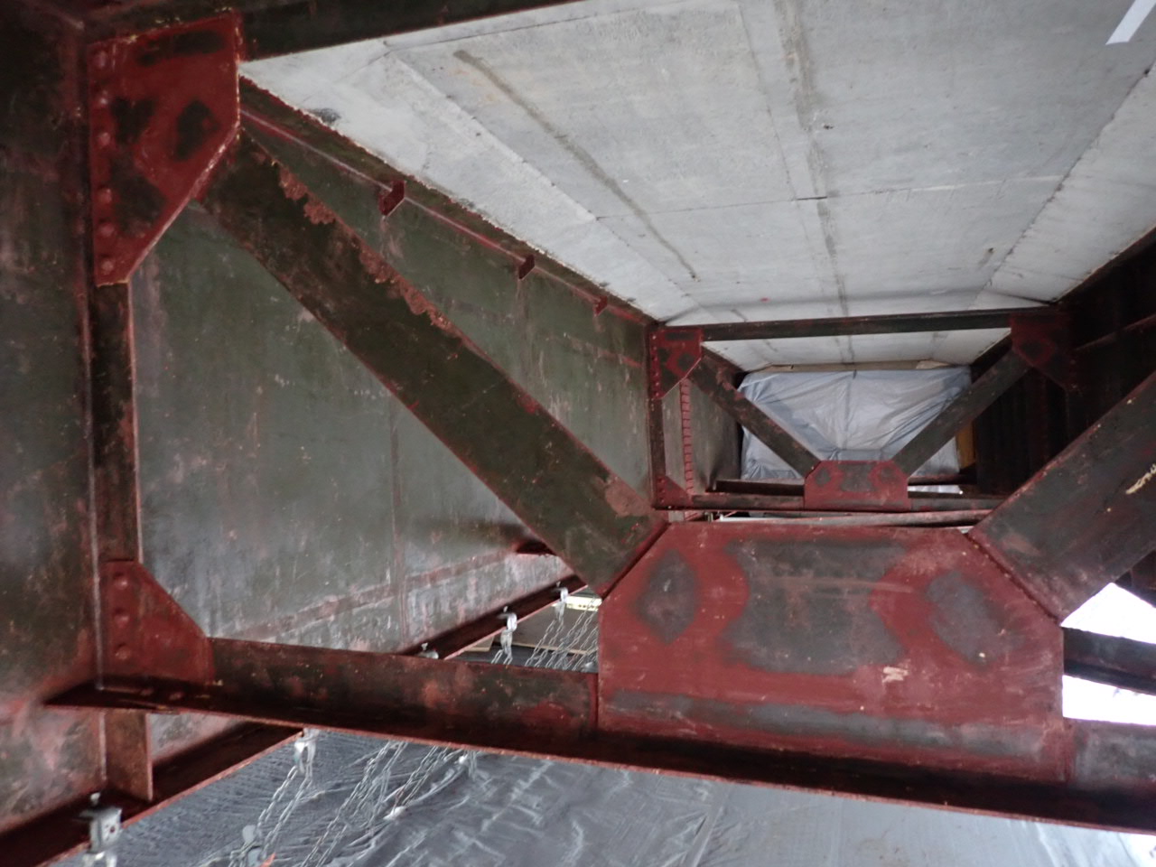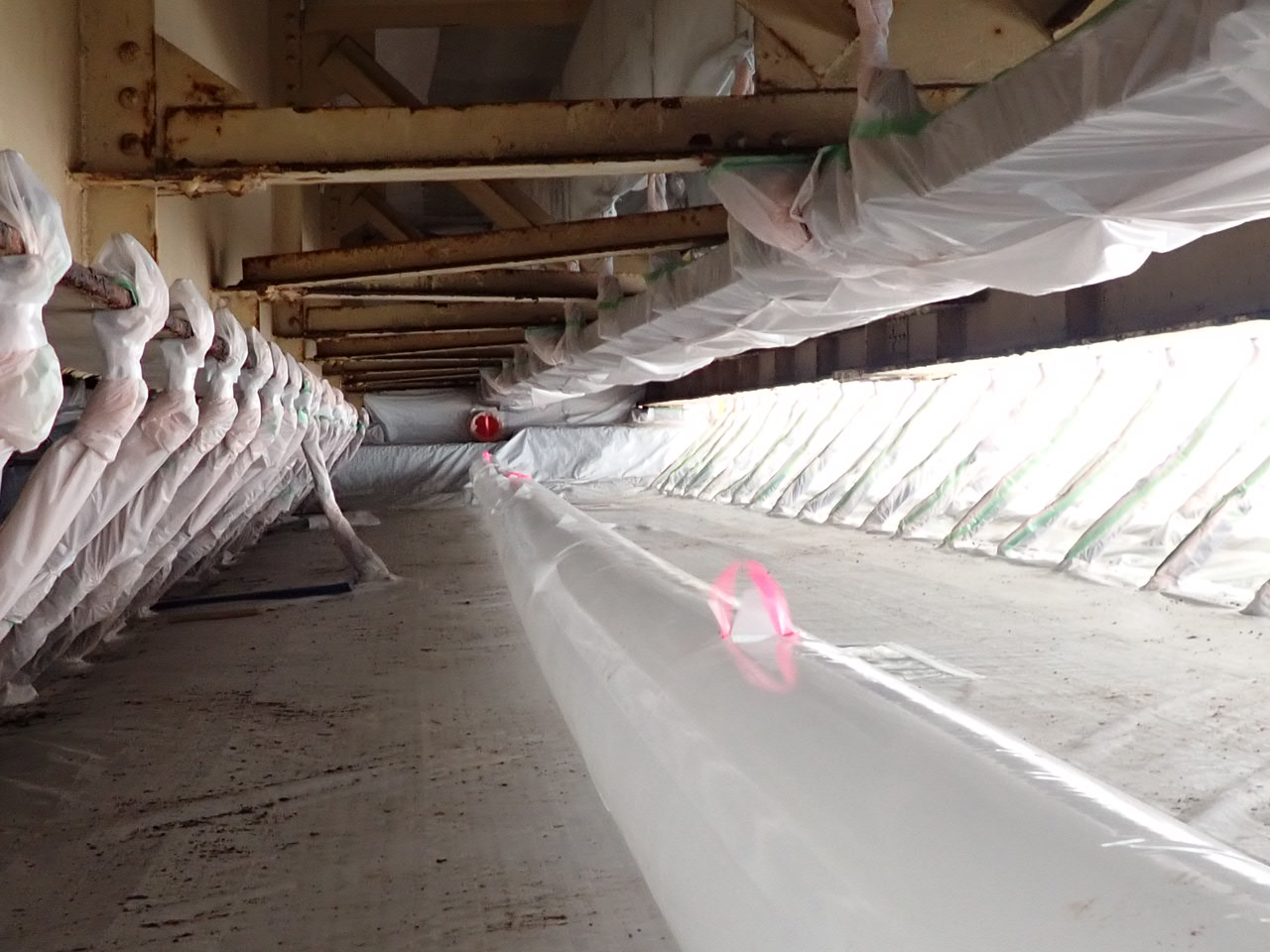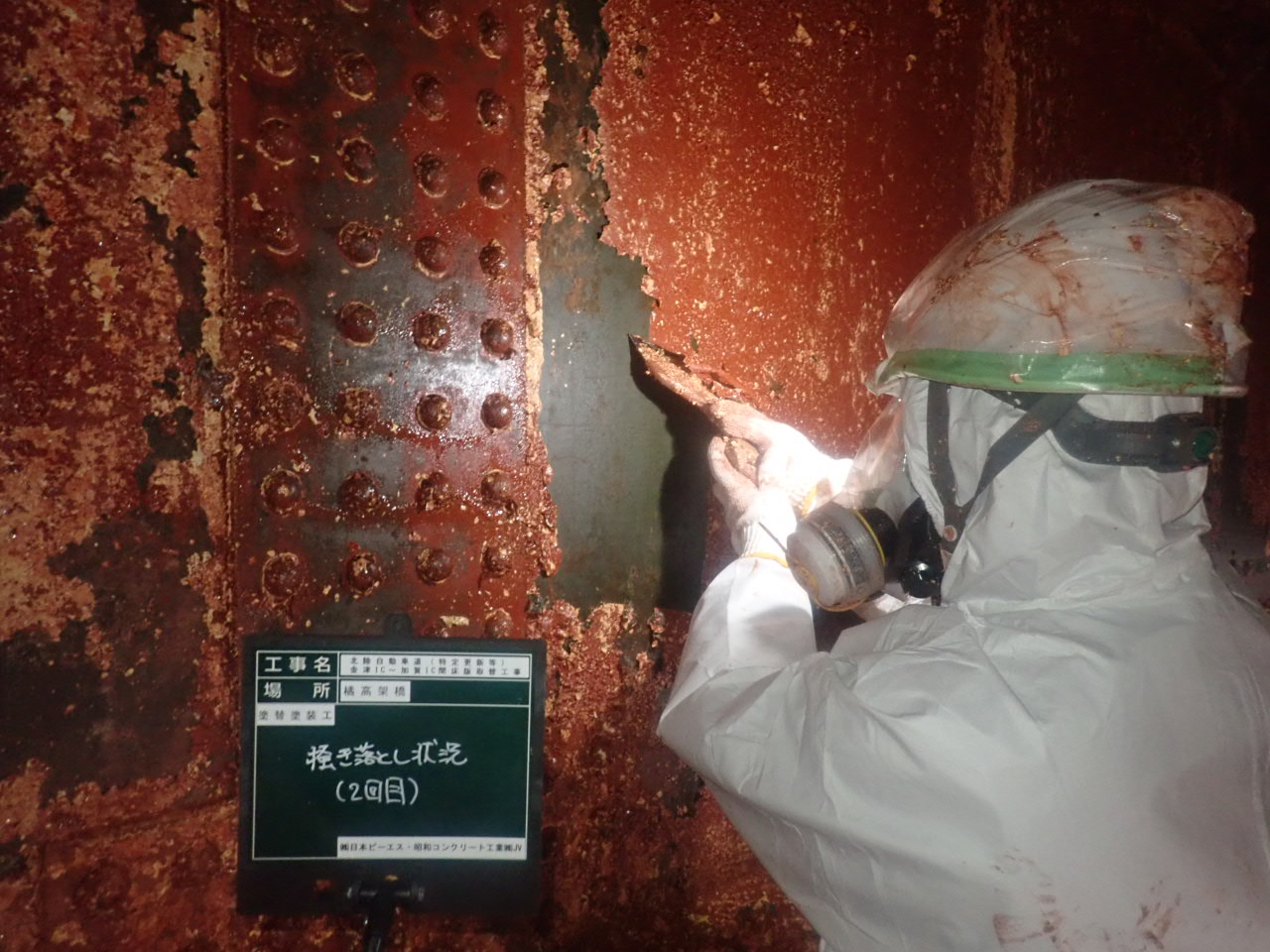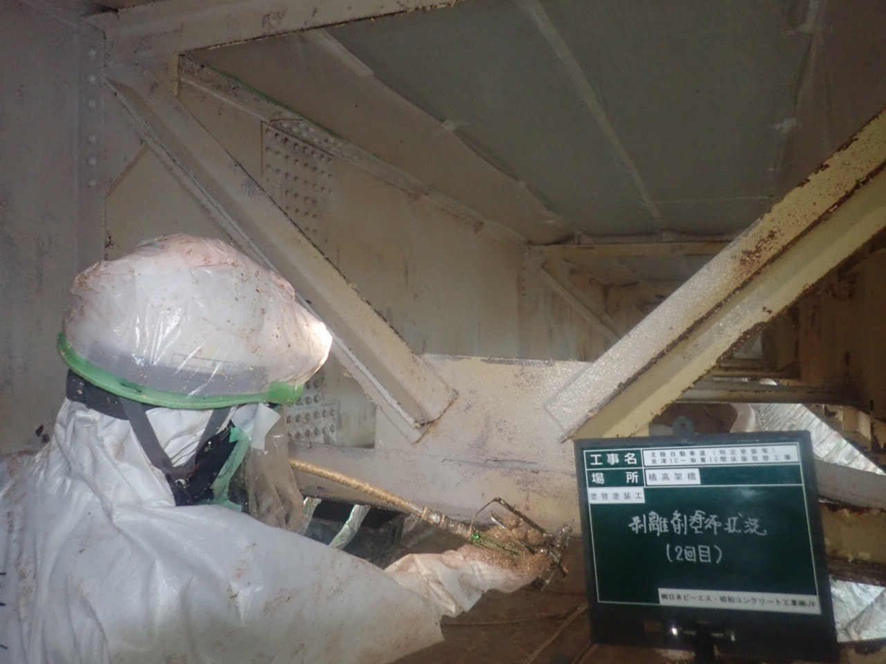 床版取替以外では上下り線ともに4,040㎡ずつ鋼桁の塗替塗装を行う。既に供用時から2回、3種ケレンによる塗替えがなされており、膜厚は最大で500~600μmに達している。また、鉛など有害物質を含む塗膜であることが確認されていることから、塗膜剥離剤を使用した塗膜除去を行い、その上で再利用できる研掃材によるブラストを施して素地調整を行い塗替える。但し、冬を迎えるまでに一種ケレンを施し、塗膜の塗替えを完了させることが難しいため、次善の策として、この秋までは塗膜剥離剤で塗膜除去を行うまでにとどめ、来春に素地調整及び塗替えを行う方針だ。なお、塗膜剥離剤は大伸化学製の『ペリカンリムーバーアクアDX』を採用している。平滑部は2回、添接部や隅角部は3回程度の塗布・掻き落としで全厚が除去できるとみなしている。