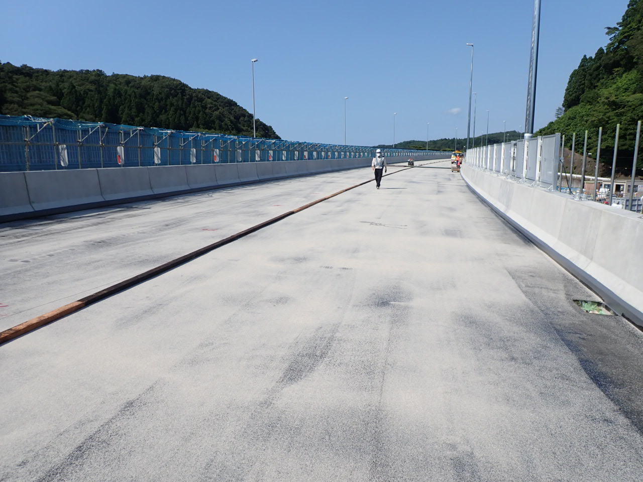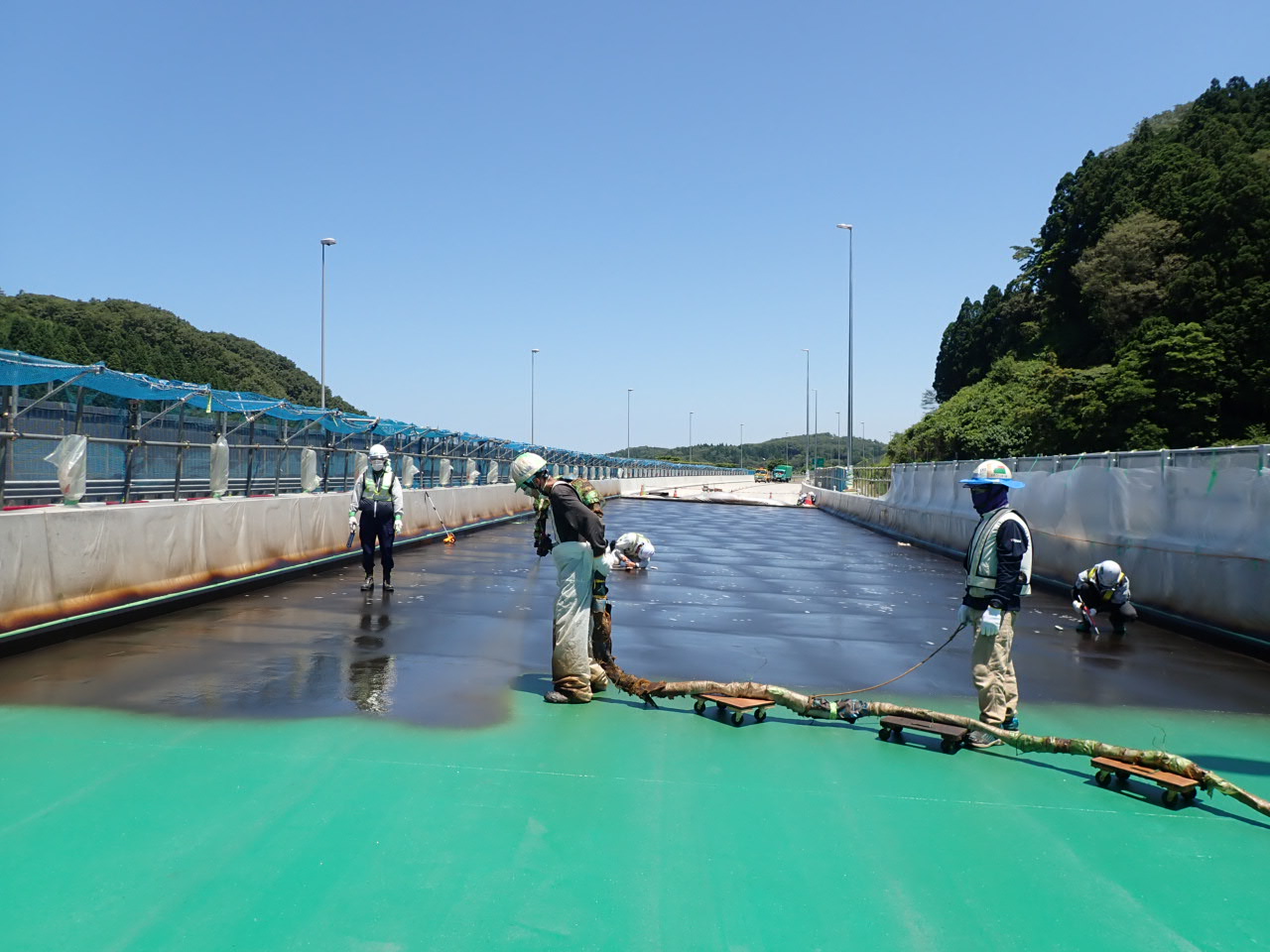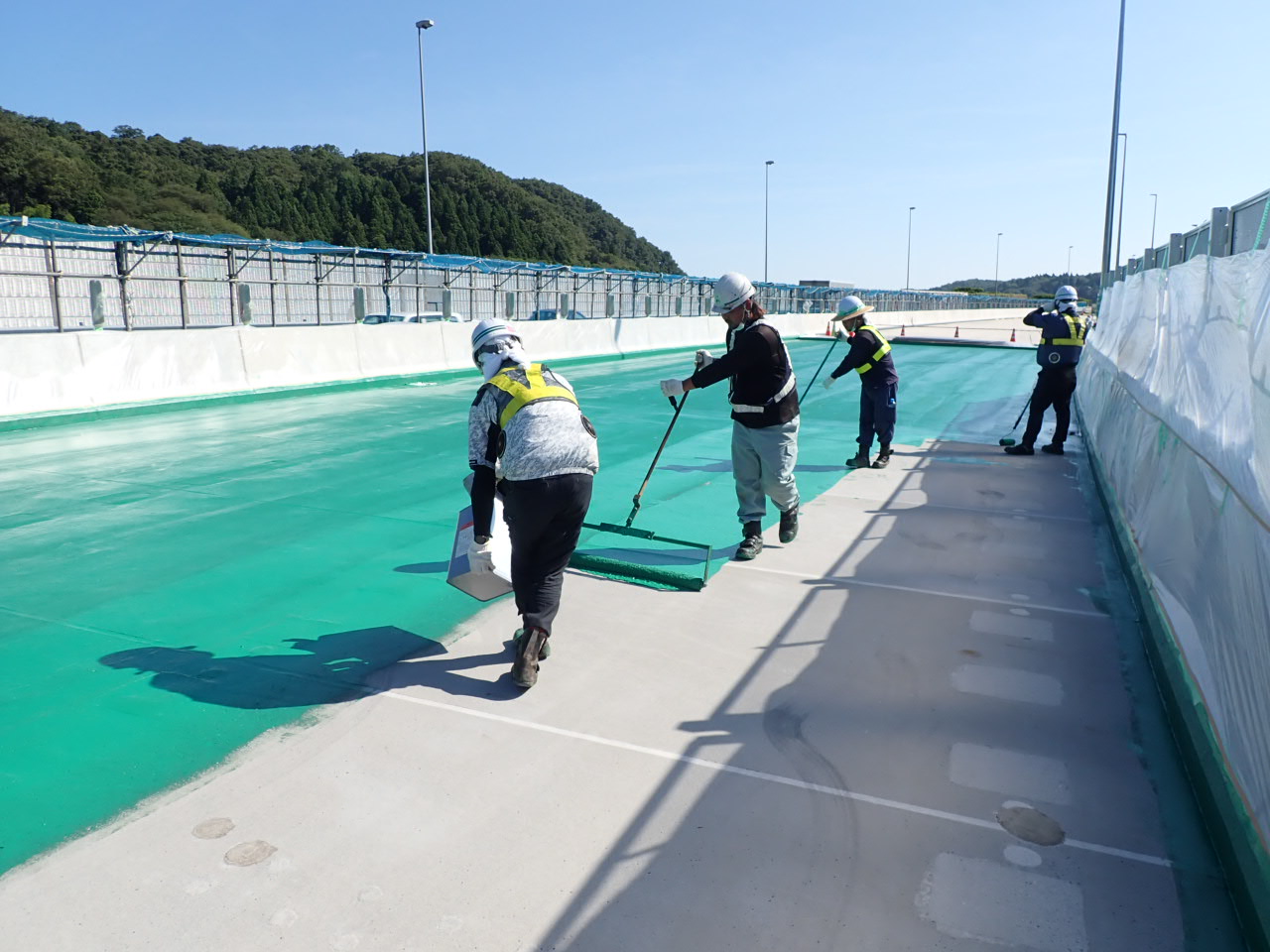 延長床版完了後は、床版全面に高性能床版防水工(HQハイブレンAU工法)を施工し、次いで基層及び表層を施工した。延長床版部も合わせた施工面積は1,573㎡で、防水工から舗装まで8日間の工程を費やしている。