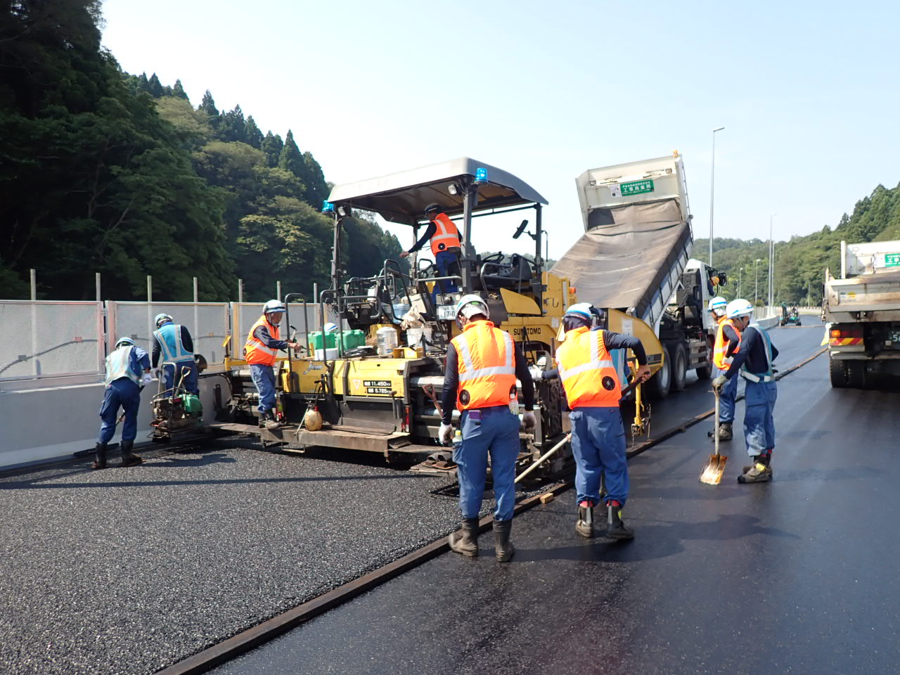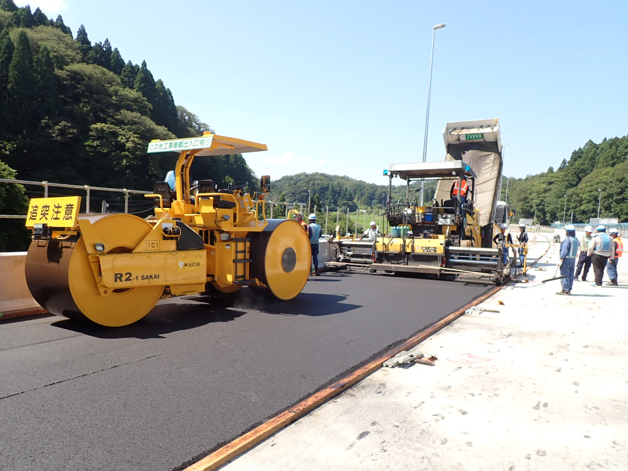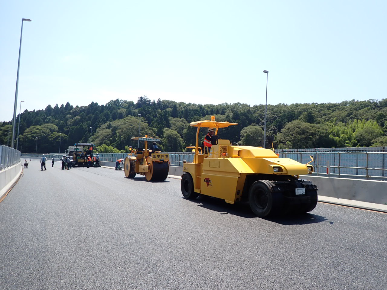 延長床版完了後は、床版全面に高性能床版防水工(HQハイブレンAU工法)を施工し、次いで基層及び表層を施工した。延長床版部も合わせた施工面積は1,573㎡で、防水工から舗装まで8日間の工程を費やしている。