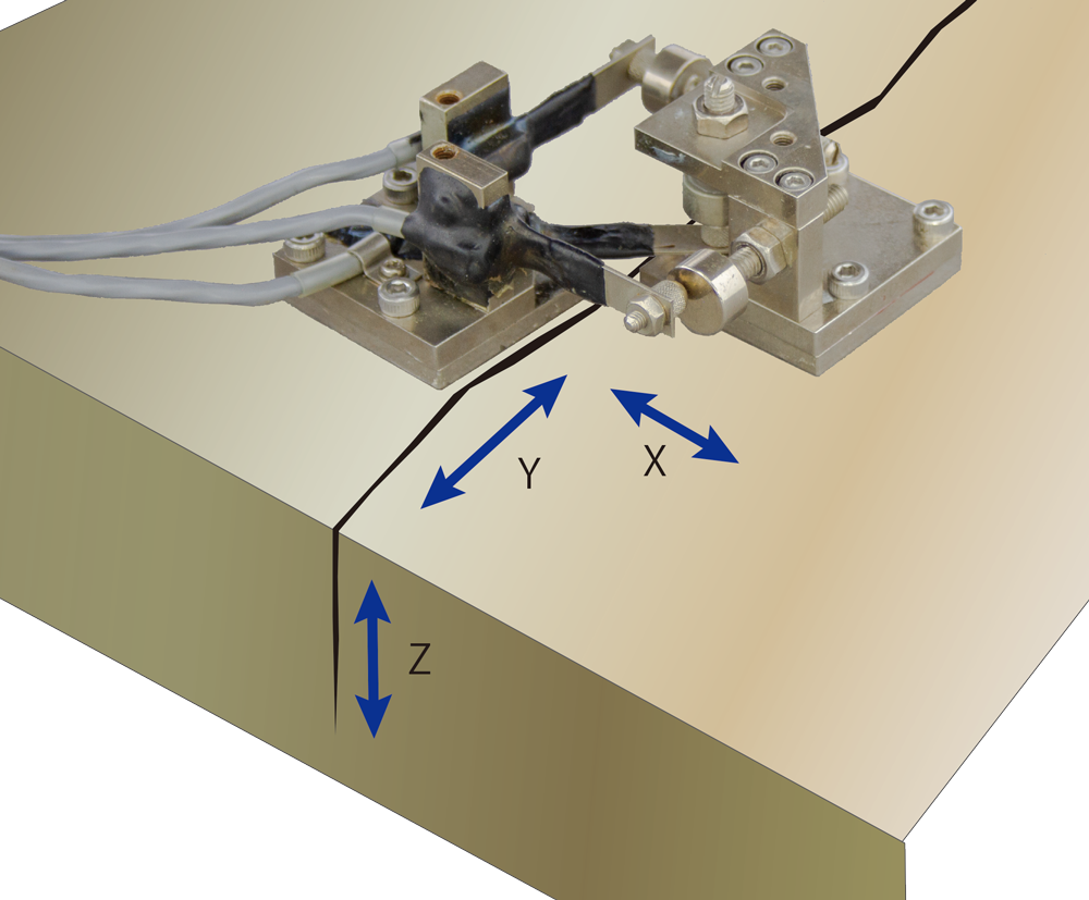M式3方向クラックゲージは、道路橋コンクリート床版の耐久性を検討するクラックゲージとして開発されたもの。カンチレバー式の変位計を3方向に付けた計測機械であり、活荷重載荷による床版に働く3つの断面力、曲げモーメント、ねじりモーメントおよび鉛直せん断力を一つのひび割れの動きで捉えるため、そのひび割れの開閉、水平ずれ、鉛直方向のずれ(段差)の動きを同時に測定するものである。通常、活荷重通過後にこうしたひび割れ挙動は床版が健全であれば走行前の状態に戻るが、すぐに戻らない場合はそのひび割れは劣化をしているという判断ができる。また、ひび割れの動きから輪荷重の大きさを逆算することもできるため、どのような荷重の車両が該当橋梁で卓越しているかというとこを確認することができる。