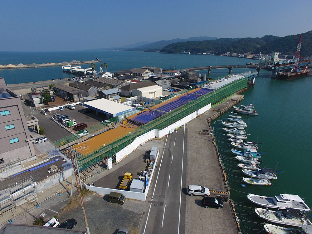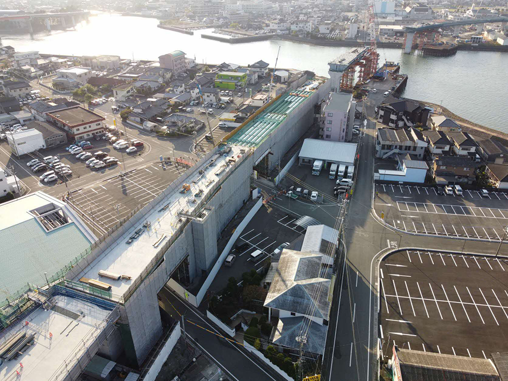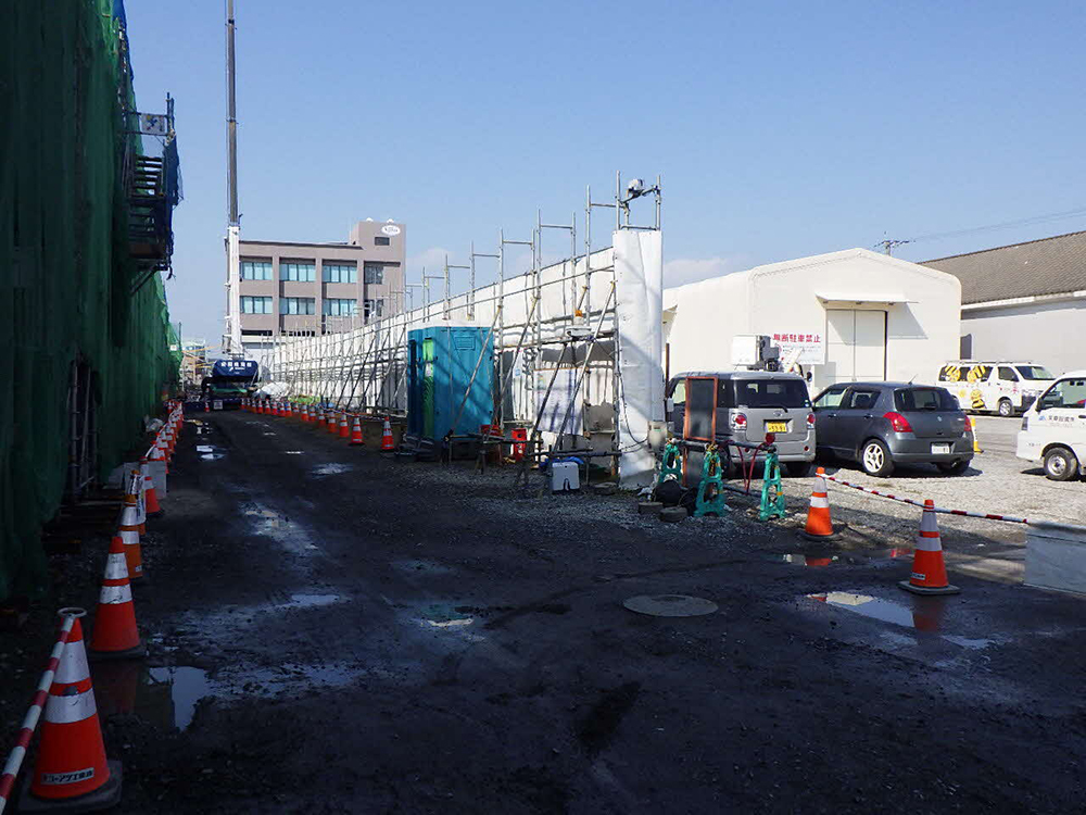 施工にあたってまず課題となったのは、各工区とも施工ヤードが手狭であったことだ。G1は工場施設と会社事務所が近接していることから、港湾道路と市道の付け替え道路を通行止めにしてヤードを確保したが、G2の工事用道路としても使用しているため、「G2との調整を密接に行わないと、双方の工事に影響が出てしまう」(G1元請のコーアツ・共栄・礎JV)という状況下での施工となった。さらに工事用車両の行き来があり、ヤードに資材を置かないようにした。