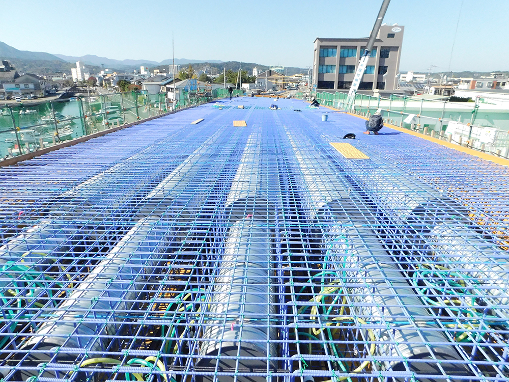 コンクリートは中空床版橋部が強度36N/mm2の早強コンクリートを使用した。水セメント比43%、スランプ12cmで、高性能AE減水剤を添加している。コンクリートかぶり厚は70mmを確保した。地覆や半壁高欄は30N/mm2の普通コンクリートでの打設となっている。
