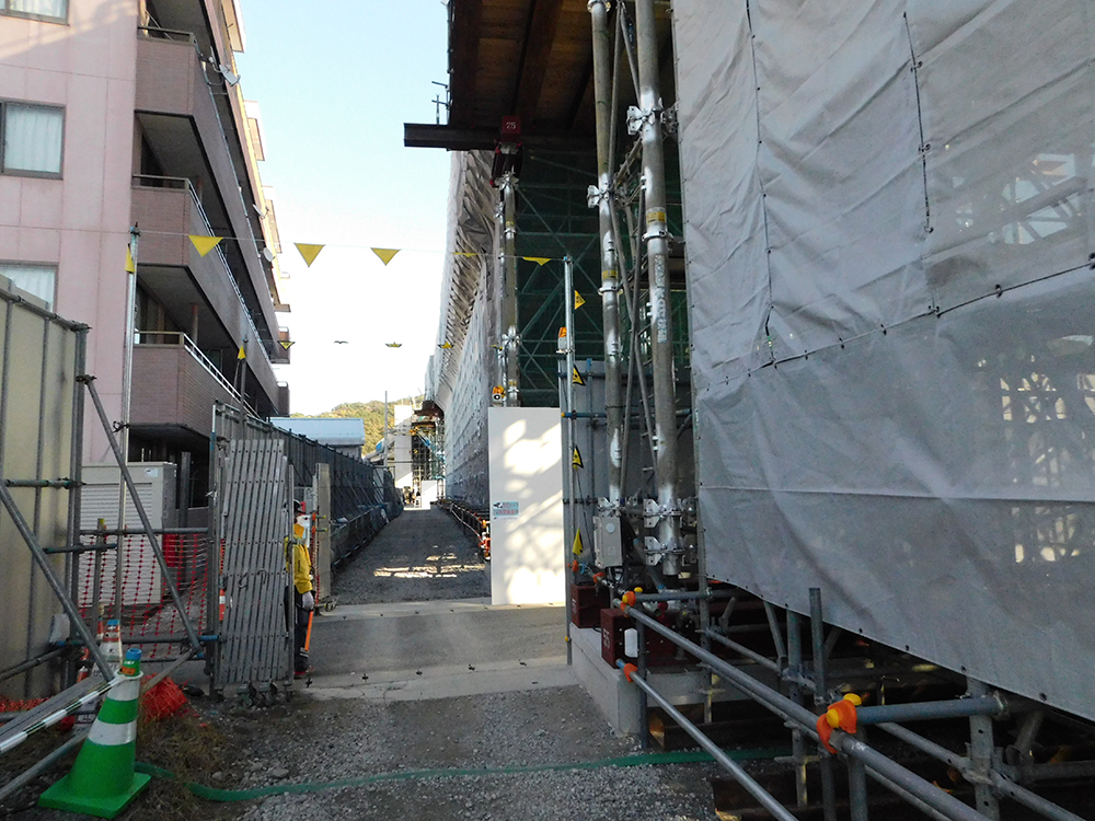 G5。管理用道路を主に施工ヤードとして使用。施工時には市道の一時通行止めも行っている(左写真=*)