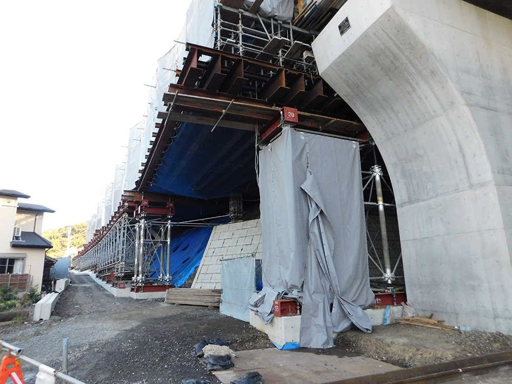 G1、G5、G6のPC中空床版橋の上部工架設は固定支保工上での現場打ち施工を行っている。支保工はくさび結合支保工を基本として、道路交差部は支柱式支保工を採用した。
