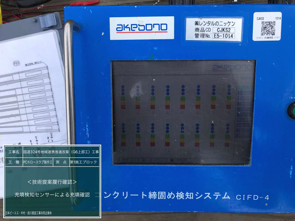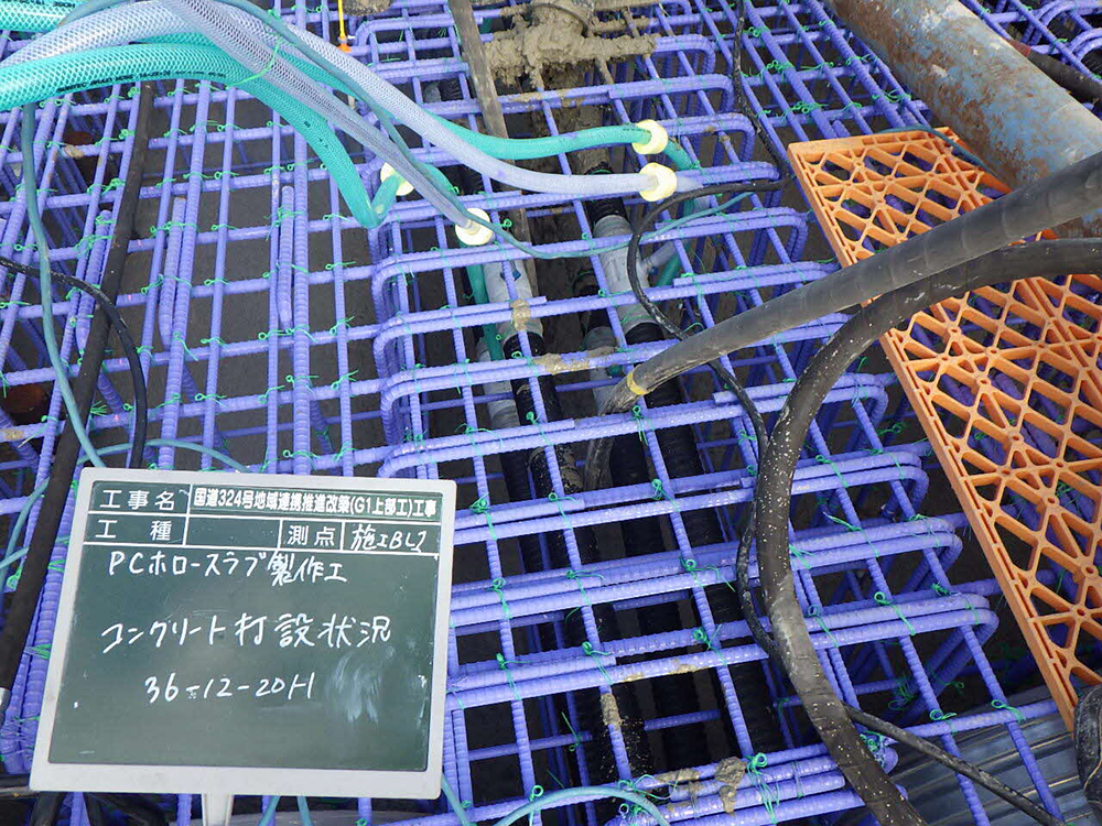 G6もマルチバイブレーターを使用し、先端をゴムで養生することにより型枠などの損傷を防いだ。さらに、コンクリート充填・締固め振動検知システム『ジュウテンダーⅡ』を使用して品質確保を図った。これは、水、空気、コンクリートを識別する小型振動デバイスにより、充填確認と締め固め程度の両方を確認できるもの。「振動デバイスを円筒型枠下面に橋軸方向1mピッチで設置したほか、PCケーブル定着面の下面にも設置して、充填不良になりやすい箇所や緊張で局部応力がかかる箇所の施工状況を確認していった」(日本ピーエス・中村・前川JV)。