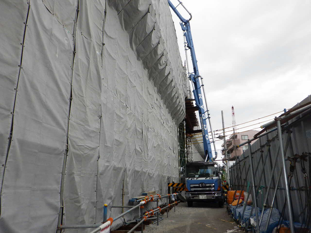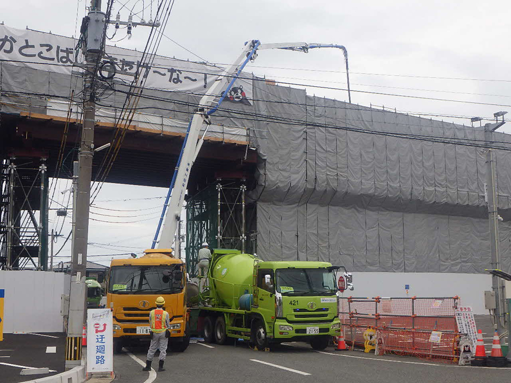 G5、G6は住宅地と隣接しているため、ヤード条件はさらに厳しい。同橋北側の開通後に管理用道路(幅員4m)となるスペースを主にヤードとして活用したが、打設時のポンプ車の配置や圧送距離などを考えるとそれだけでは不十分で国道や市道を跨ぐG6では民間地を借り上げてヤードを確保し、同じく市道を跨ぐG5では打設時に市道の一時通行止めを行った。