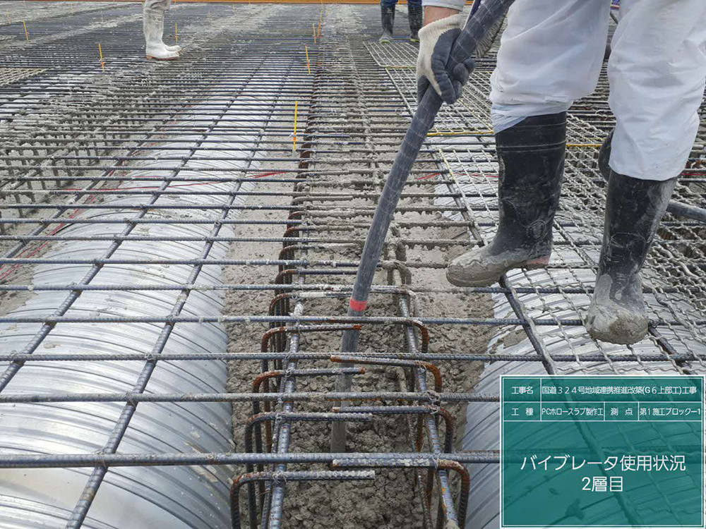 G1では、「通常のφ50mmのバイブレーターでは施工できないので、φ28mmで2.6mの長柄付きの小径強力バイブレーターを使用し、密実なコンクリートを打設できるようにした」(コーアツ・共栄・礎JV)。