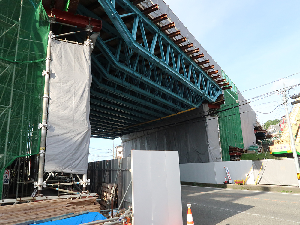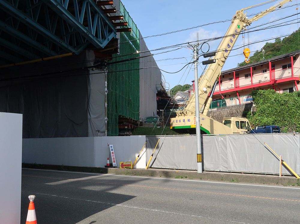 「ヤードの確保が難しかったことから、施工計画を変更した」(G5元請のピーエス三菱・苓州・オオマスJV)(施工手順については後述)ことや、「クレーンの設置場所も限られているので資材は橋面上を横取りして搬出入しなければならなかった。また(ヤードが狭小で資材を置くスペースがほとんどないため)協力会社のトラックを常時走らせ、資材の搬出入を小まめに行うようにした」(G6元請の日本ピーエス・中村・前川JV)といった対応を余儀なくされた。さらに、近隣への騒音に配慮するため、各工区とも防音シートを設置している。