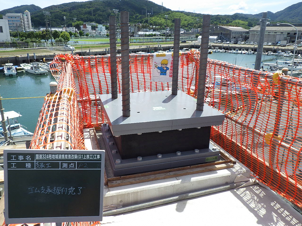 固定支保工構築後は、型枠、配筋、打設に移っていくが、各工区とも工程短縮を図るためとヤード内でのクレーン設置が限られることから、支承の据え付けを先行して行った。支承は、ビー・ビー・エム製の機能分散型支承「HSB」を採用し、塩害対策として溶融亜鉛めっき後に粉体塗装を施している。