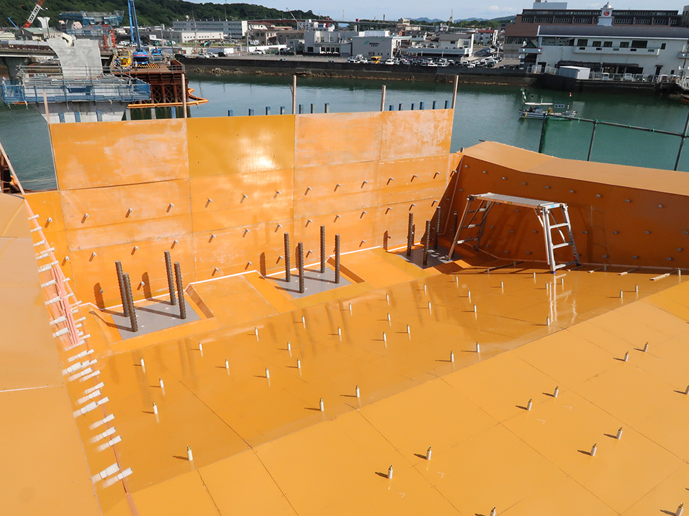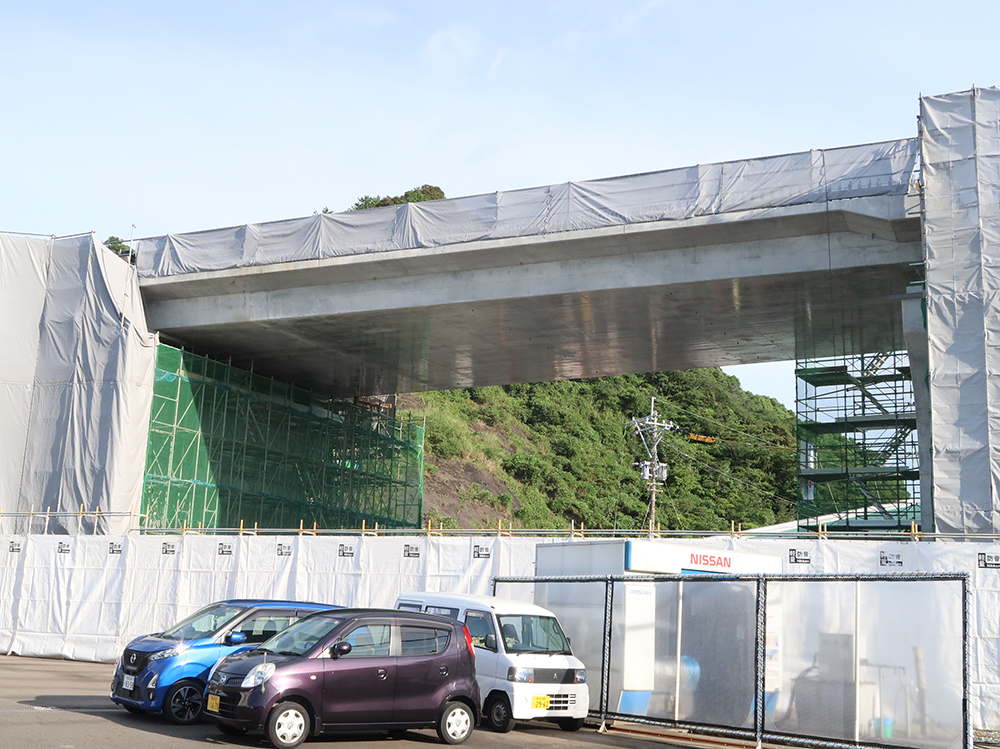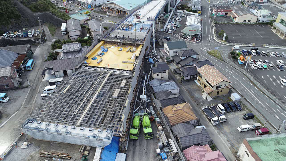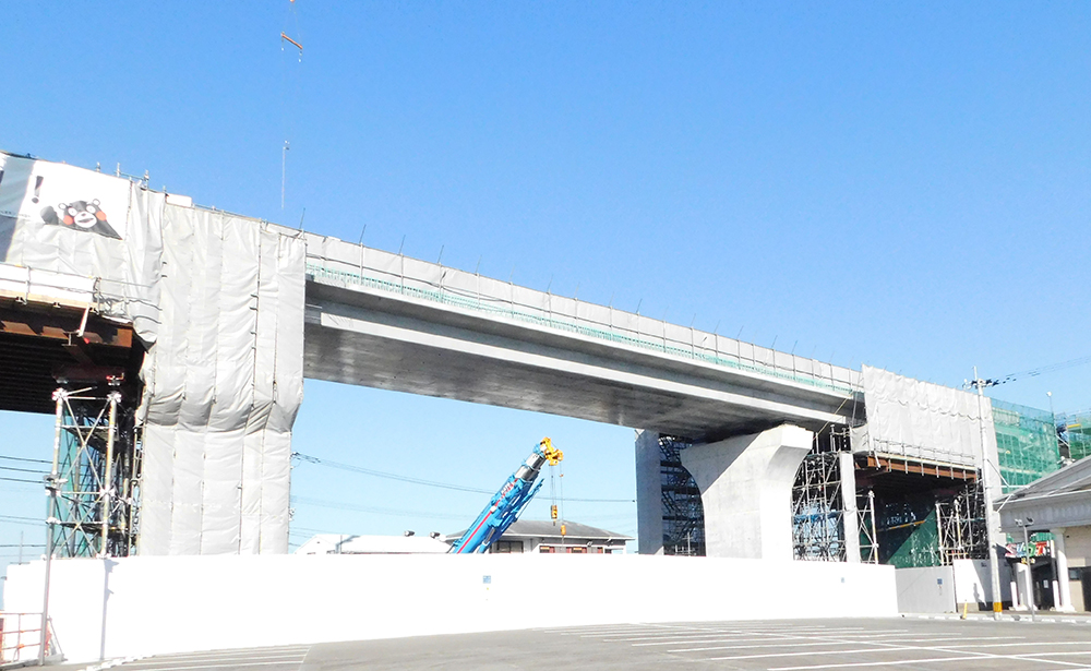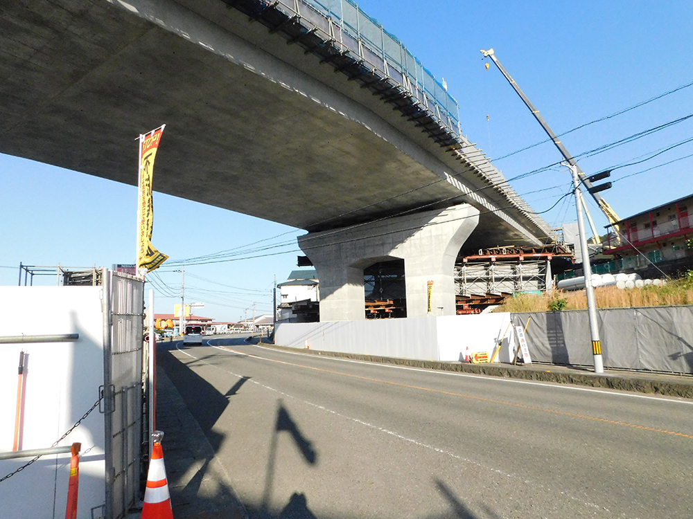 10月上旬にはP25を6.3m超えた地点までの600m3、12月上旬にはP26を6.1m超えた地点までの680m3の打設を完了し、1月下旬にはP27まで600m3の打設を行う予定だ。連続部の合計打設量は2,900m3。単径間部は、来年2月中旬にオフランプ(280m3)、3月上旬にオンランプ(500m3)の打設予定となっている。