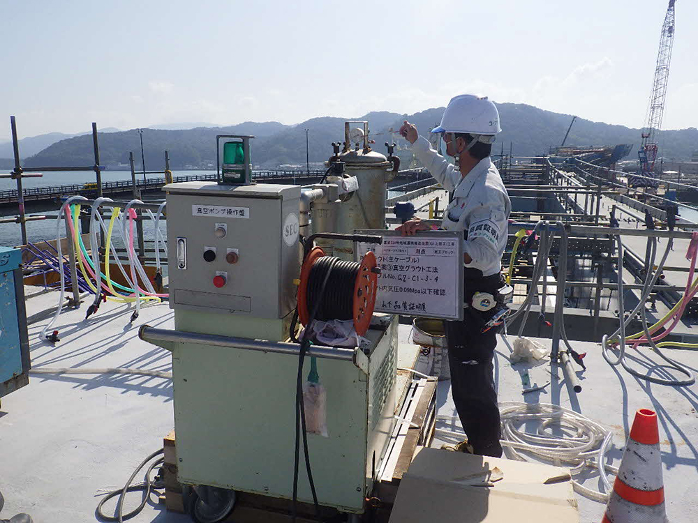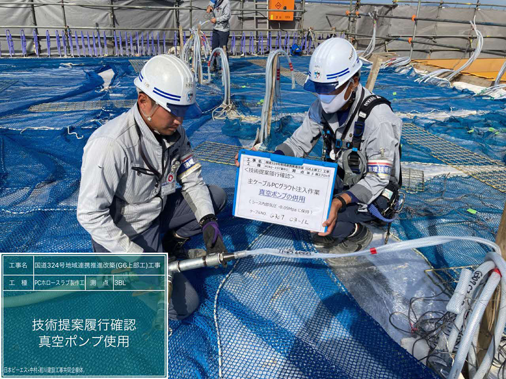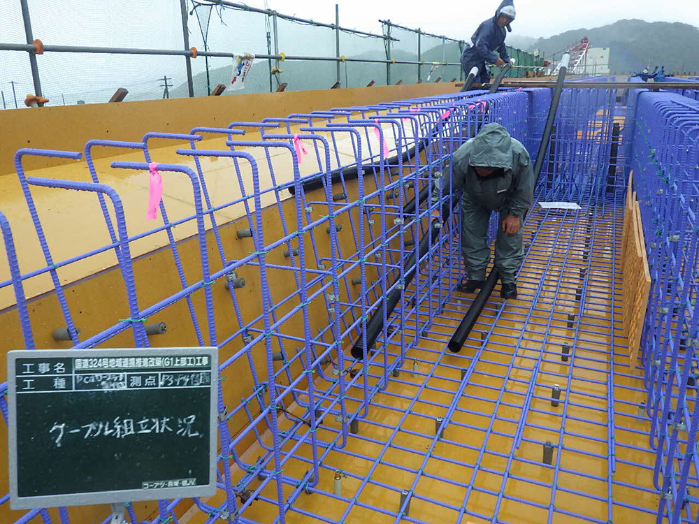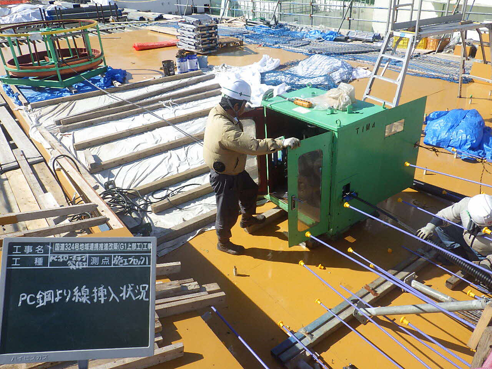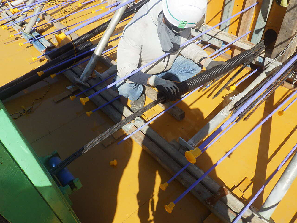 PC緊張では、各工区ともに12本より17.8mmのPC鋼より線を採用し、施工箇所によりマルチストランドVシステムなどによる両引きもしくは片引き(G1は両引き・片引きの両方、G5、G6は片引きのみ)での施工を行っている。シースは塩害対策と耐久性の観点から、G1では栗本鐵工所製の、G5では東拓工業製のポリエチレンシースを採用した(G6はメッキシース)。グラウト充填は真空グラウト法を採用して、充填性向上を図っている。