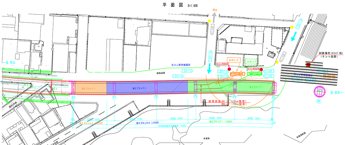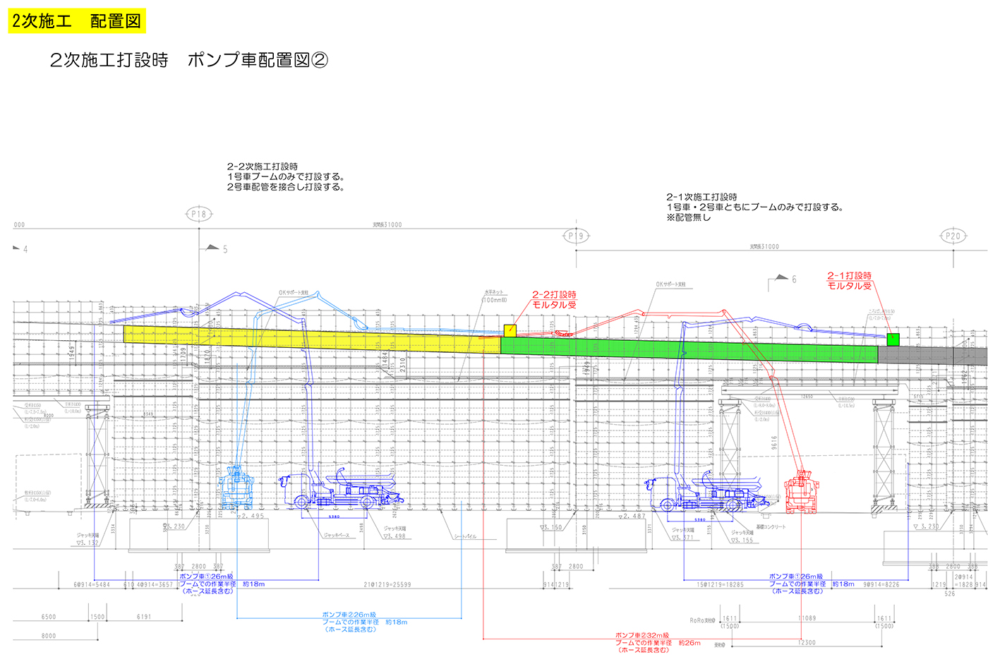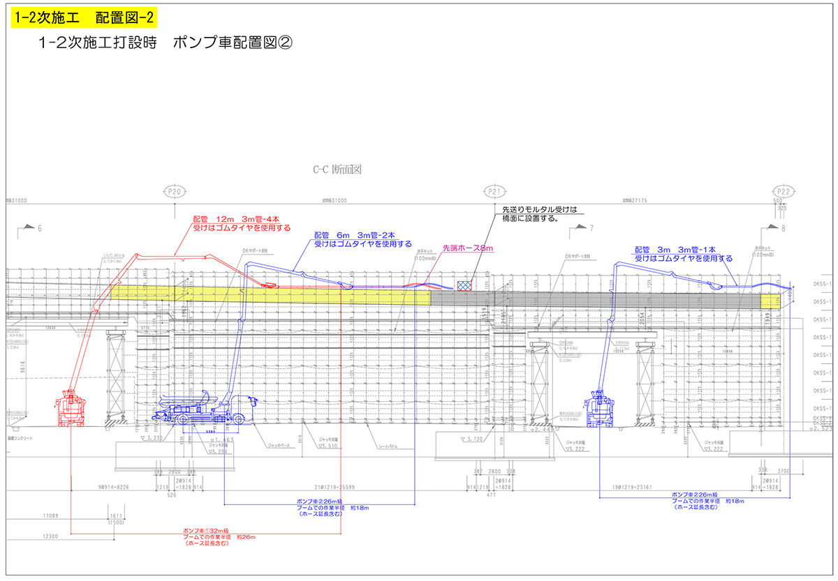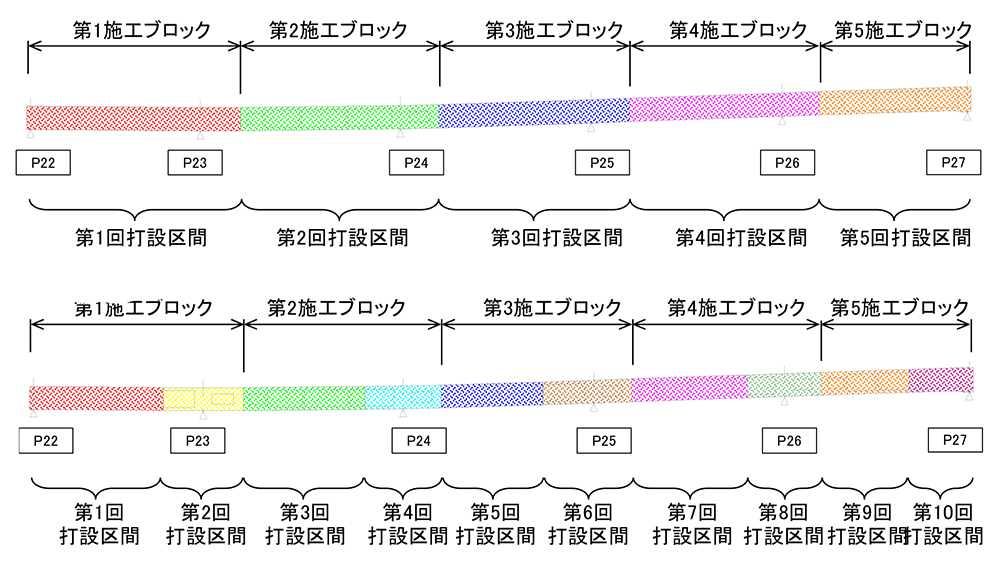 打設は当初計画では、①P22~P21を6.2m超えた地点②~P18を6.2m超えた地点③~P16での3分割施工だったが、使用できるヤードと打設量の点から変更を行い、実施工では、①P22~P21②~P20③~P19を6.2m超えた地点④~P18を6.2m超えた地点⑤~P16の5分割施工とした。