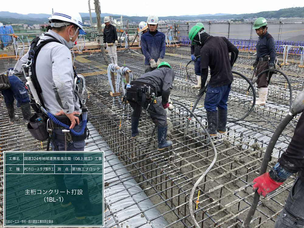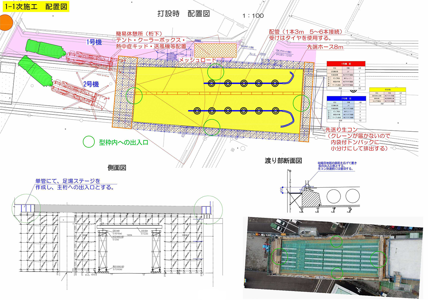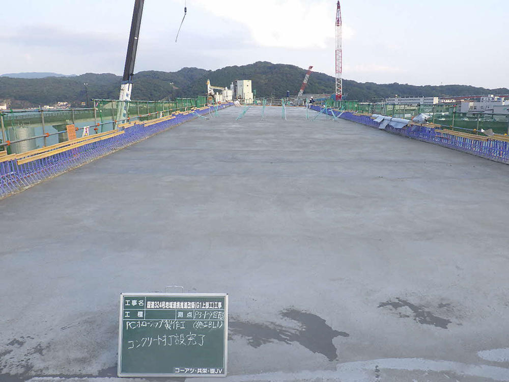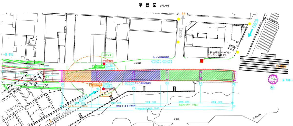 打設は当初計画では、①P22~P21を6.2m超えた地点②~P18を6.2m超えた地点③~P16での3分割施工だったが、使用できるヤードと打設量の点から変更を行い、実施工では、①P22~P21②~P20③~P19を6.2m超えた地点④~P18を6.2m超えた地点⑤~P16の5分割施工とした。