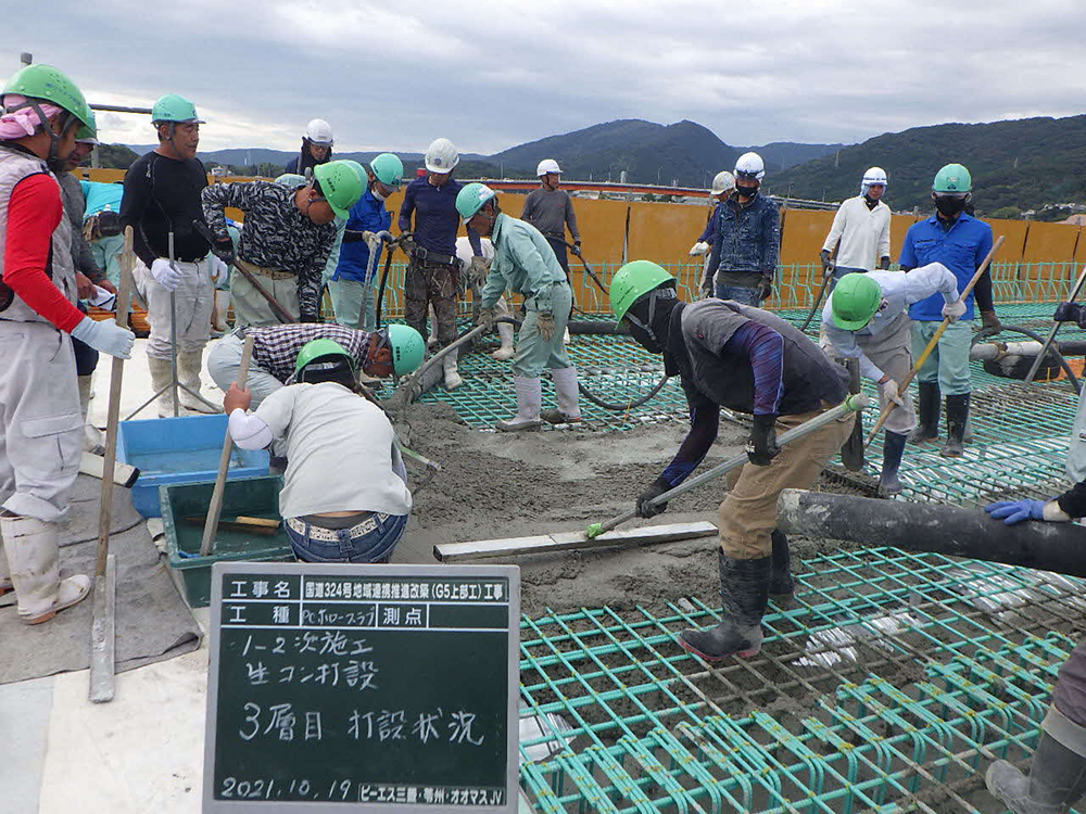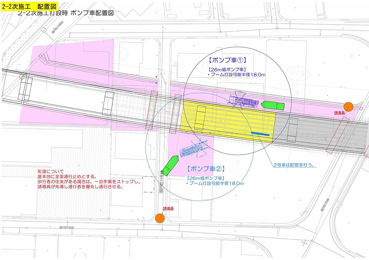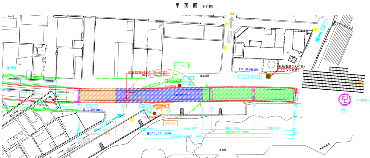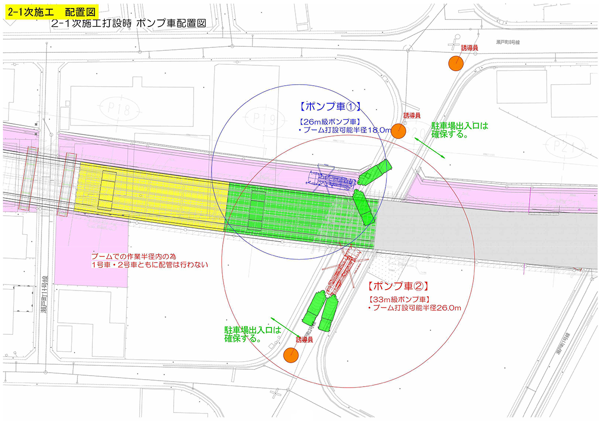 打設量は、1回目(8月中旬)300m3、2回目(10月上旬)250m3、3回目(10月下旬)250m3、4回目(11月上旬)250m3、5回目(12月下旬予定)470m3で、合計1,520m3となる。2回目では、P19~P20間の市道を通行止めのうえ施工ヤードとして使用して打設を行った(両側にも市道があり迂回路として使用可能だったため)。