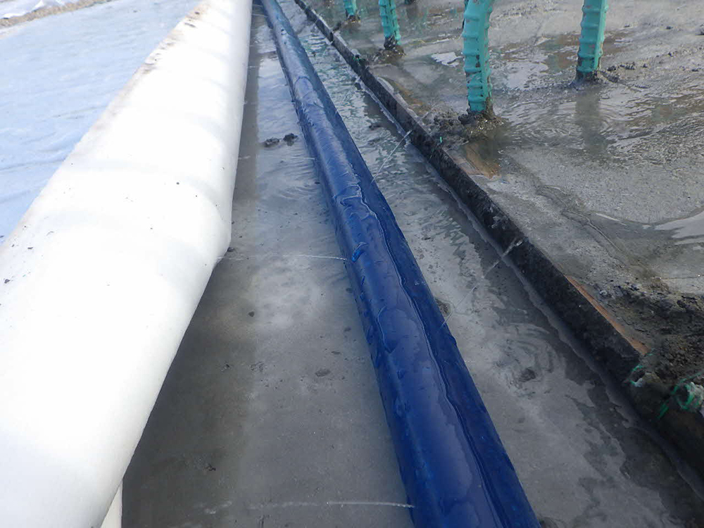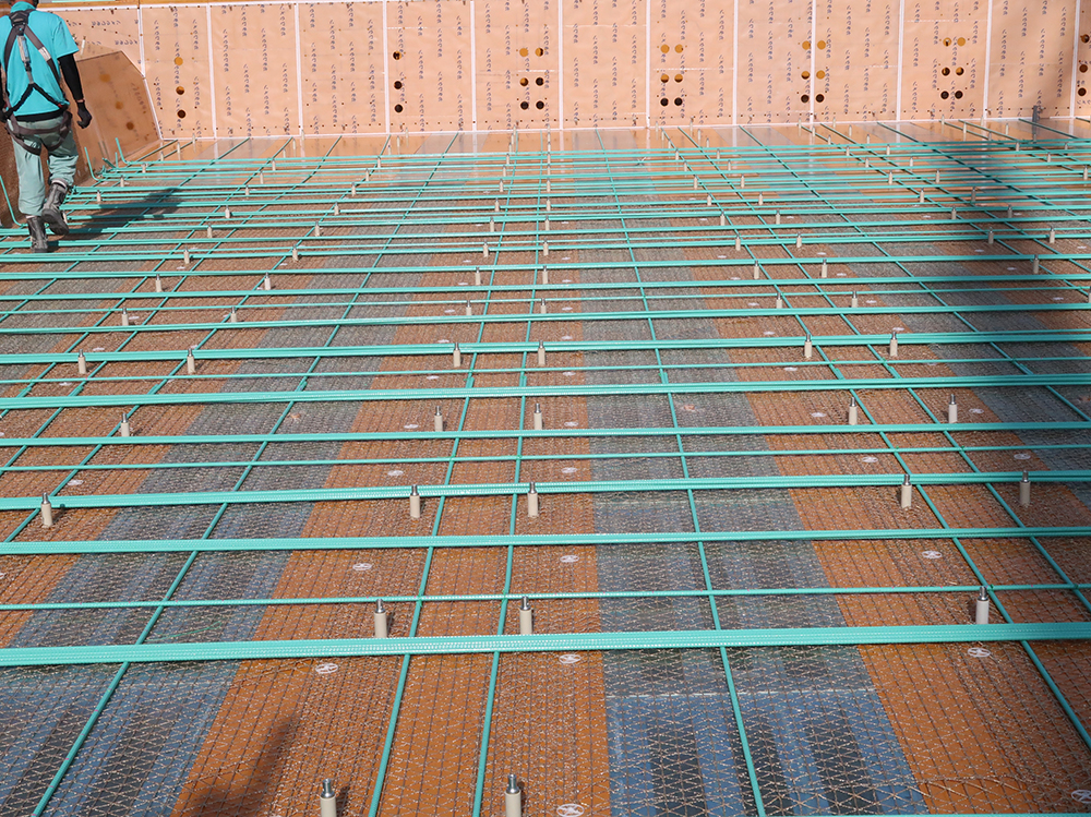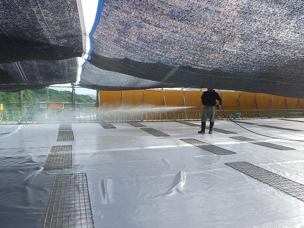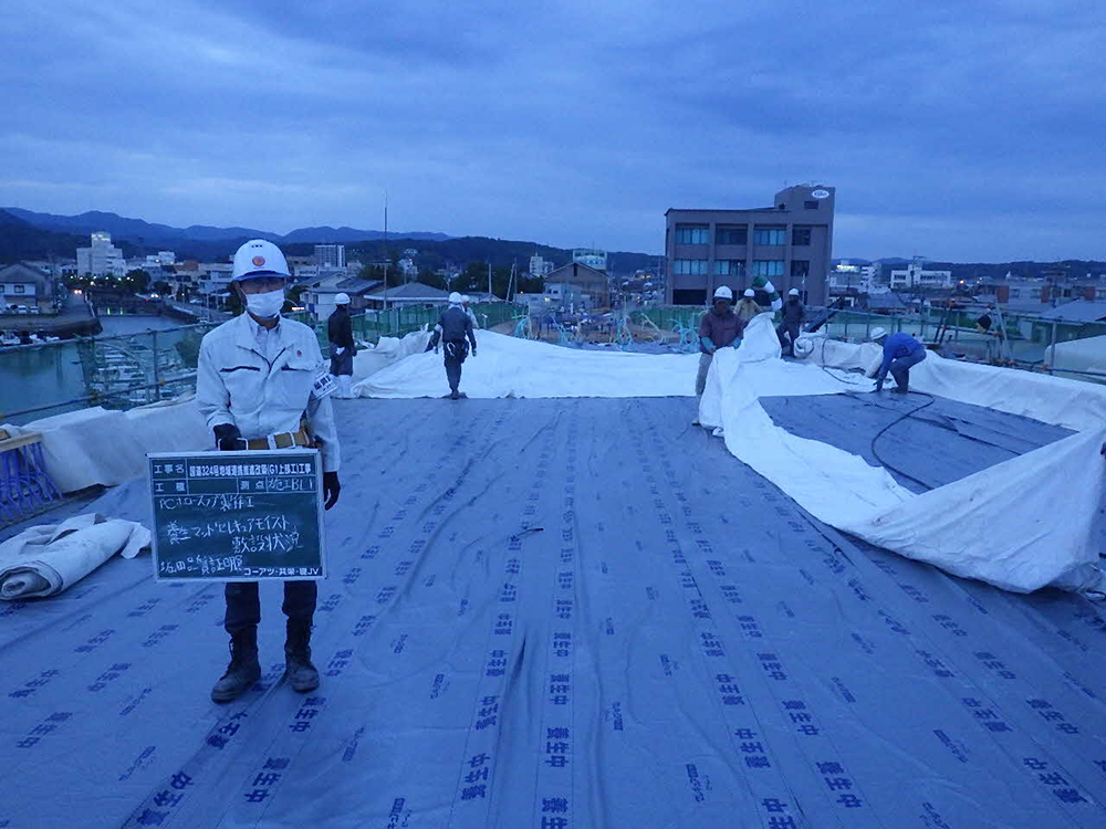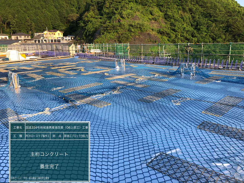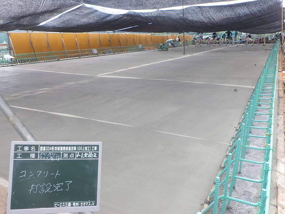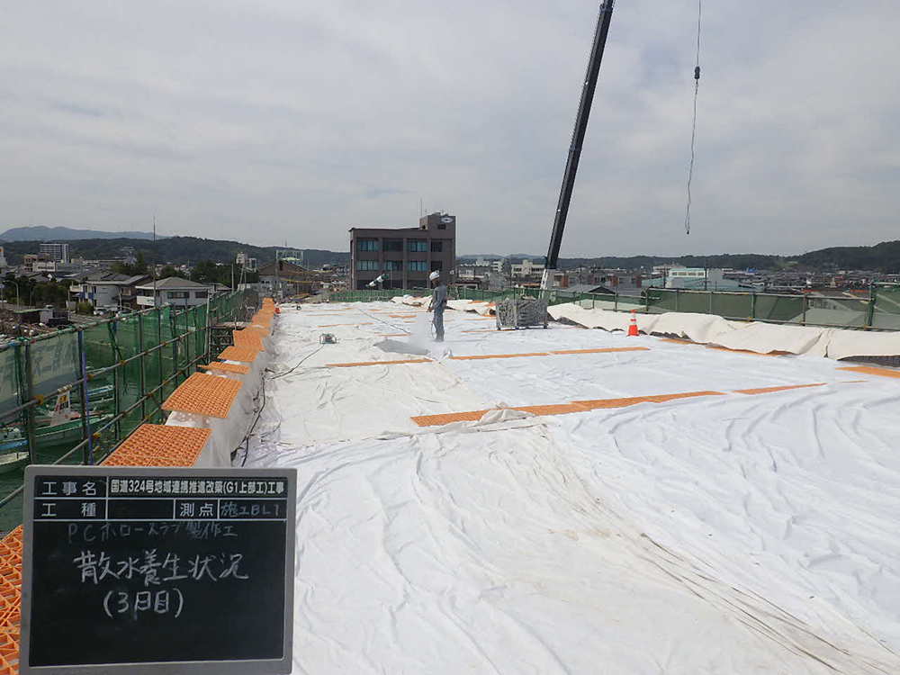 国道1箇所、市道2箇所の交差道路上はG5と同じく3軸メッシュシート(テクノーラSAMMシート)を採用している。皮膜養生剤はプロキュアを使用し、養生は湿潤養生マット(アクアマットSPタイプ)を用いて28日間の長期養生を実施している。