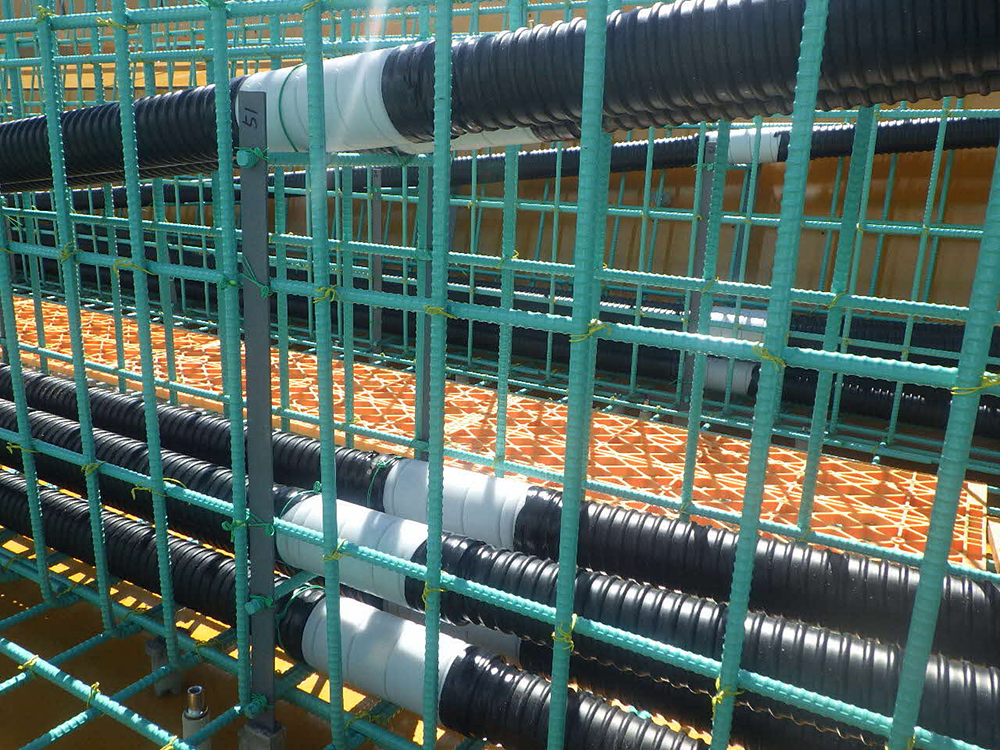 圧送距離は5回目(P16~P17とP18)の打設がブーム長30m、最大時水平60mと最長となるが、それよりも暑中での打設となった1回目のほうが「リスクが大きかった」(ピーエス三菱・苓州・オオマスJV)という。1回目の圧送距離は鉛直と水平あわせて約60mだったが、暑中コンクリート対策として主に高性能AE減水剤(遅延型)の使用や打設箇所上空全面に遮光ネットを設置、配管に養生マットを設置した。