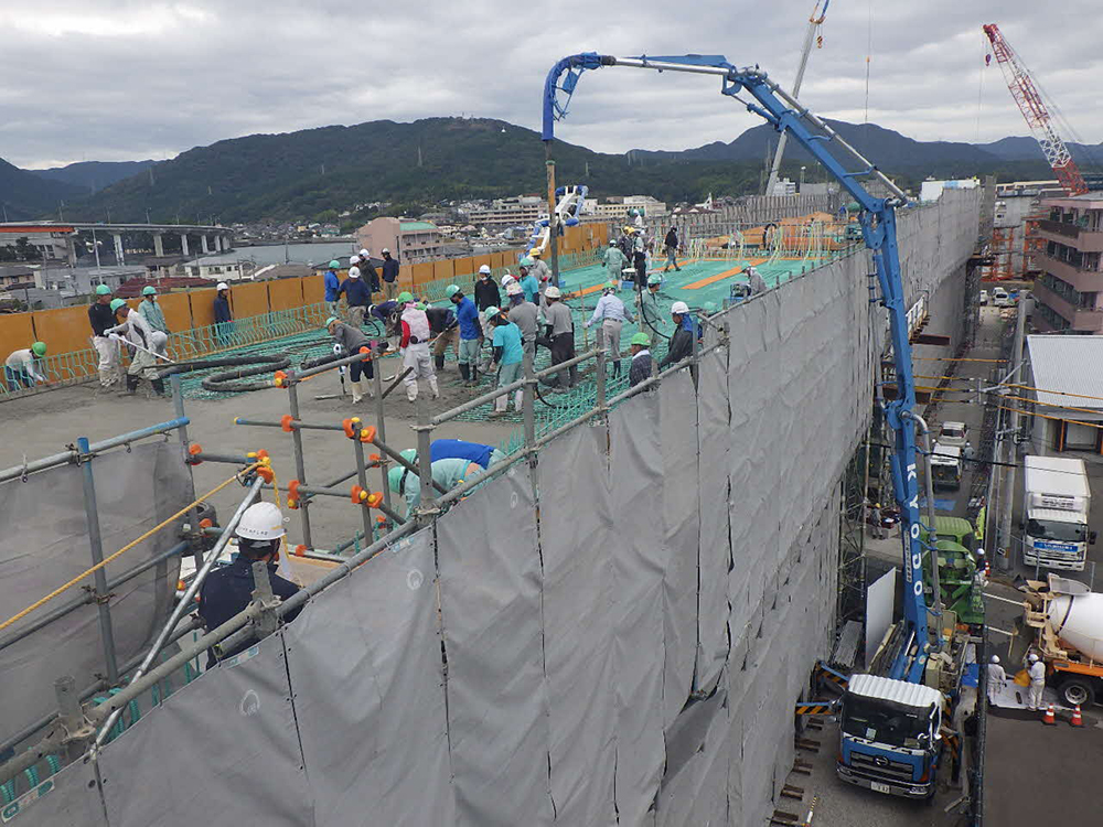 打設状況と打設完了。施工ヤードが狭小であることが分かる