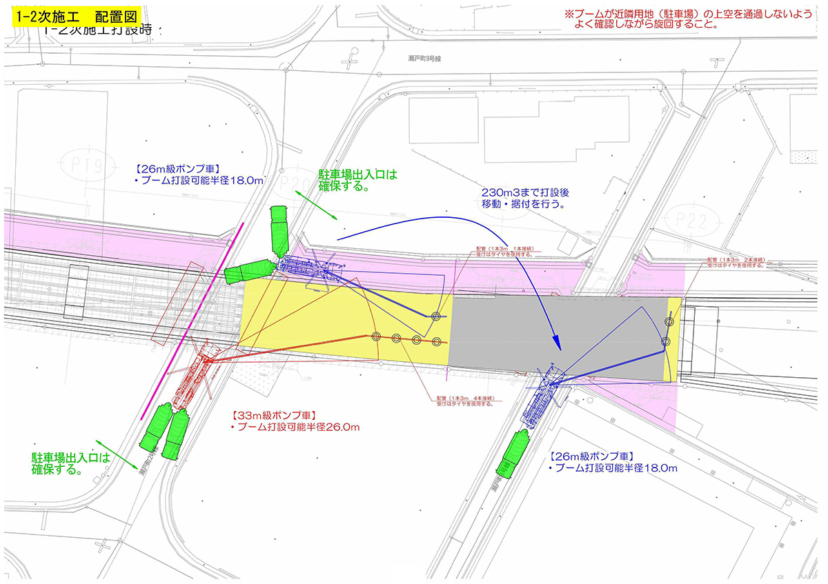 初回施工時にはP22側の国道横のスペースをヤードとして使用したが、支保工があったため、「ポンプ車1台を配置するのがやっとだった」(同)という。2回目からは、国道と反対側(A2側)の民間地を借り上げてヤードとしたが、こちらも狭小なスペースとなった。