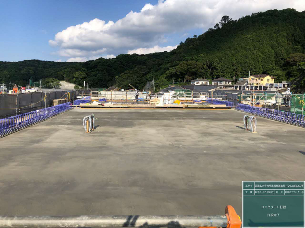 打設完了/養生状況/国道324号上の橋体(右写真=*)