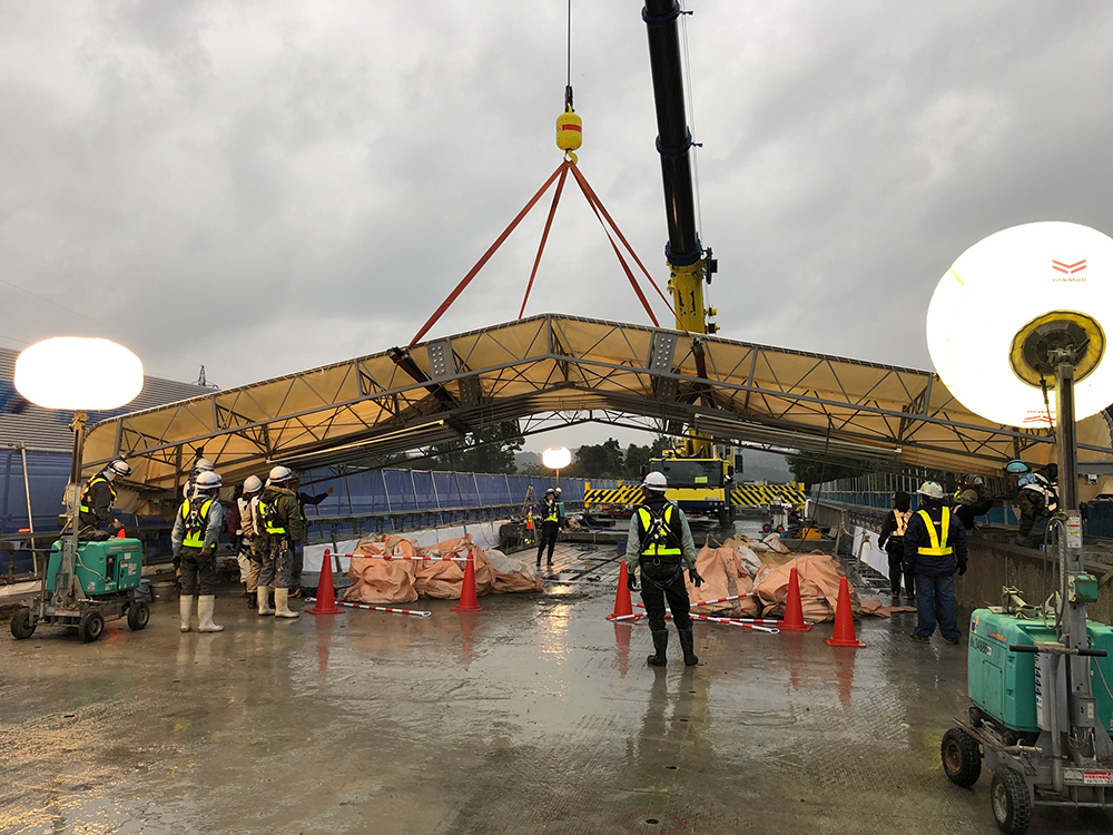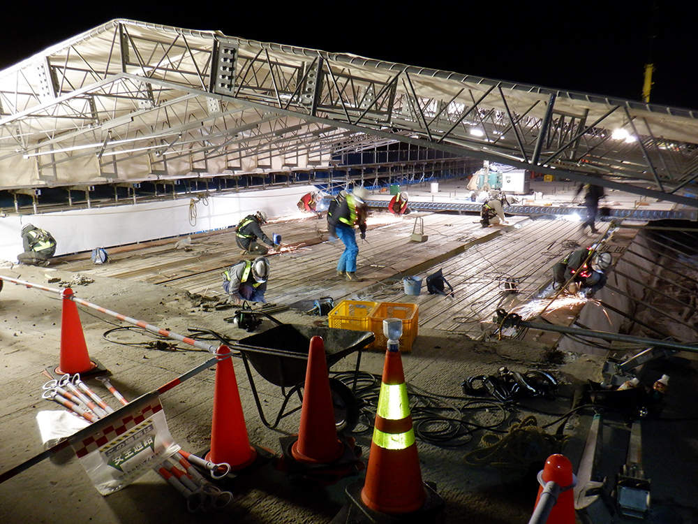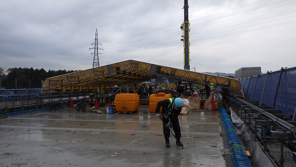 短工期のなかで雨天などによる工程遅延を防ぐために、移動式伸縮屋根を設置したことも本現場の特徴だ。橋軸方向最大約15m×橋軸直角方向約13m×高さ2.3m、重量3tで、地組立後、クレーンにより架設した。足場上に敷設したレールに設置することで橋軸方向の移動が可能になり、上フランジ上面の研掃や塗装、新設床版設置後の間詰コンクリート打設などの作業を天候の影響を受けずに進めることができた。