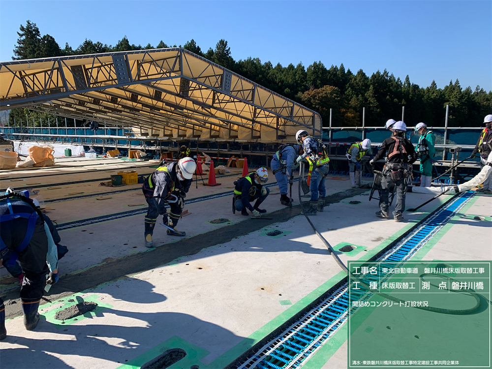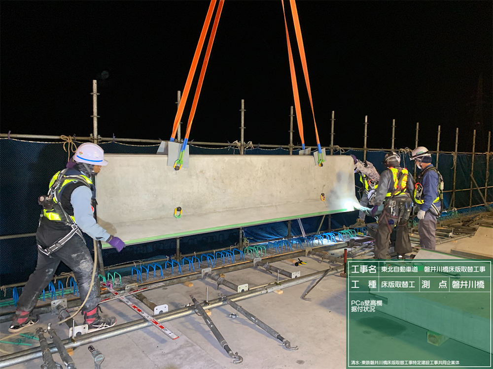 元請は、清水・東鉄JV。一次下請は、共成建設(床版取替)、栄喜工業(床版取替)、岡崎建設(渡り線・舗装工)、青砥建設(渡り線)、SEI’S(渡り線)、東北カッター(床版切断、はつり工)、大和重機(クレーン)、東北ビルド(クレーン)、岡部(スタッドジベル)、岡本産業(床版防水工)など