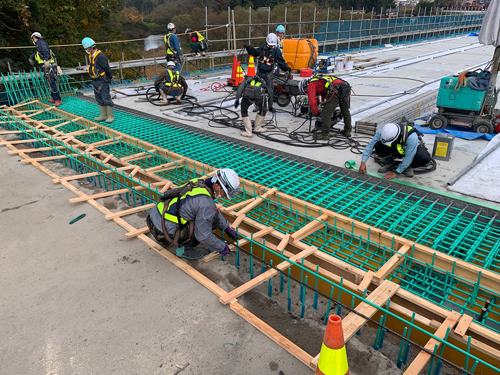 継手部はループ継手を採用し、間詰コンクリートの打設幅は380mmで施工している。間詰部は、膨張材(太平洋ハイパーエクスパン)25kg/m3を添加した早強コンクリートを用い、強度50N/mm2、スランプ15cmとした。鉄筋は、床版継手部分と現場打ち部分にエポキシ樹脂塗装鉄筋を使用して耐食性を確保している。