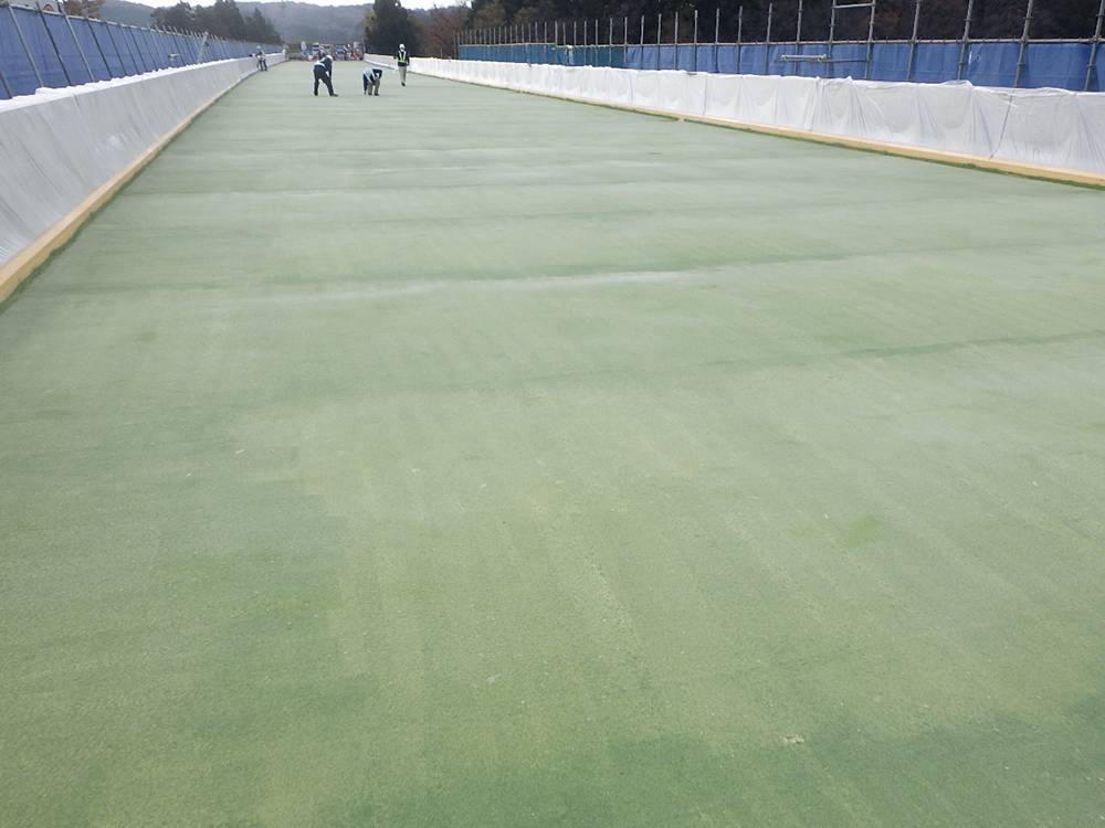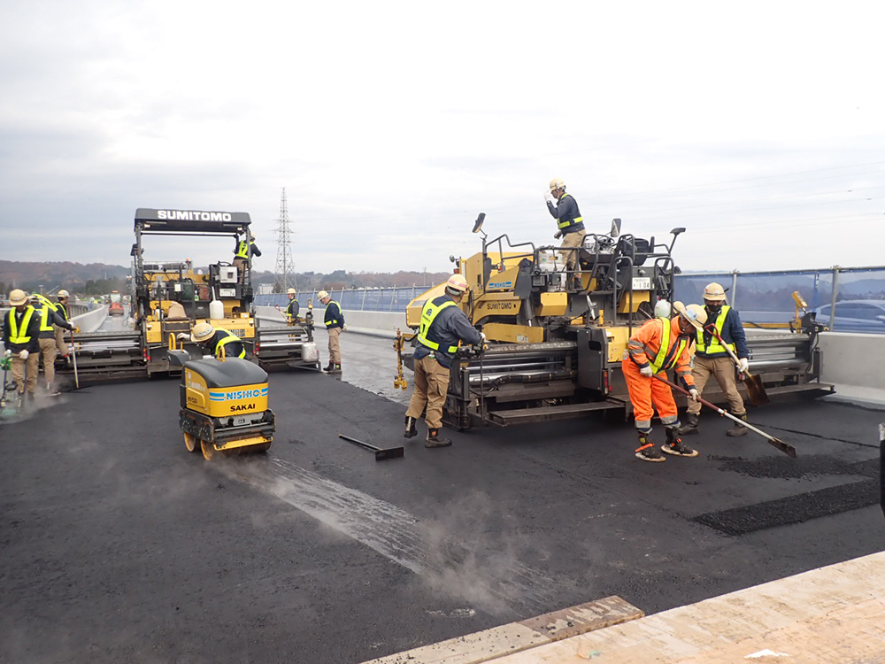 床版防水は高性能床版防水工法(グレードⅡ)を採用し、オルタックスプレーES-A工法で施工した。舗装は、レベリング工がFB13、表層は高機能舗装Ⅱ型で舗設している。施工日数は防水工4日、舗装工2日だった。