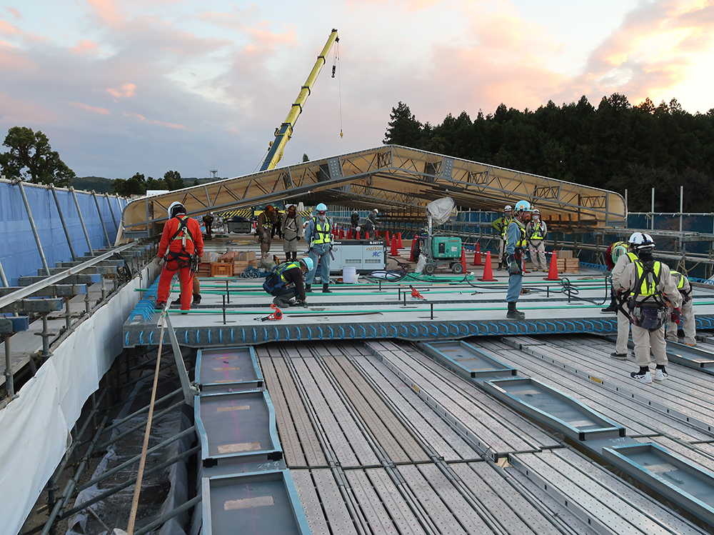 移動式伸縮屋根は地組立後、架設した