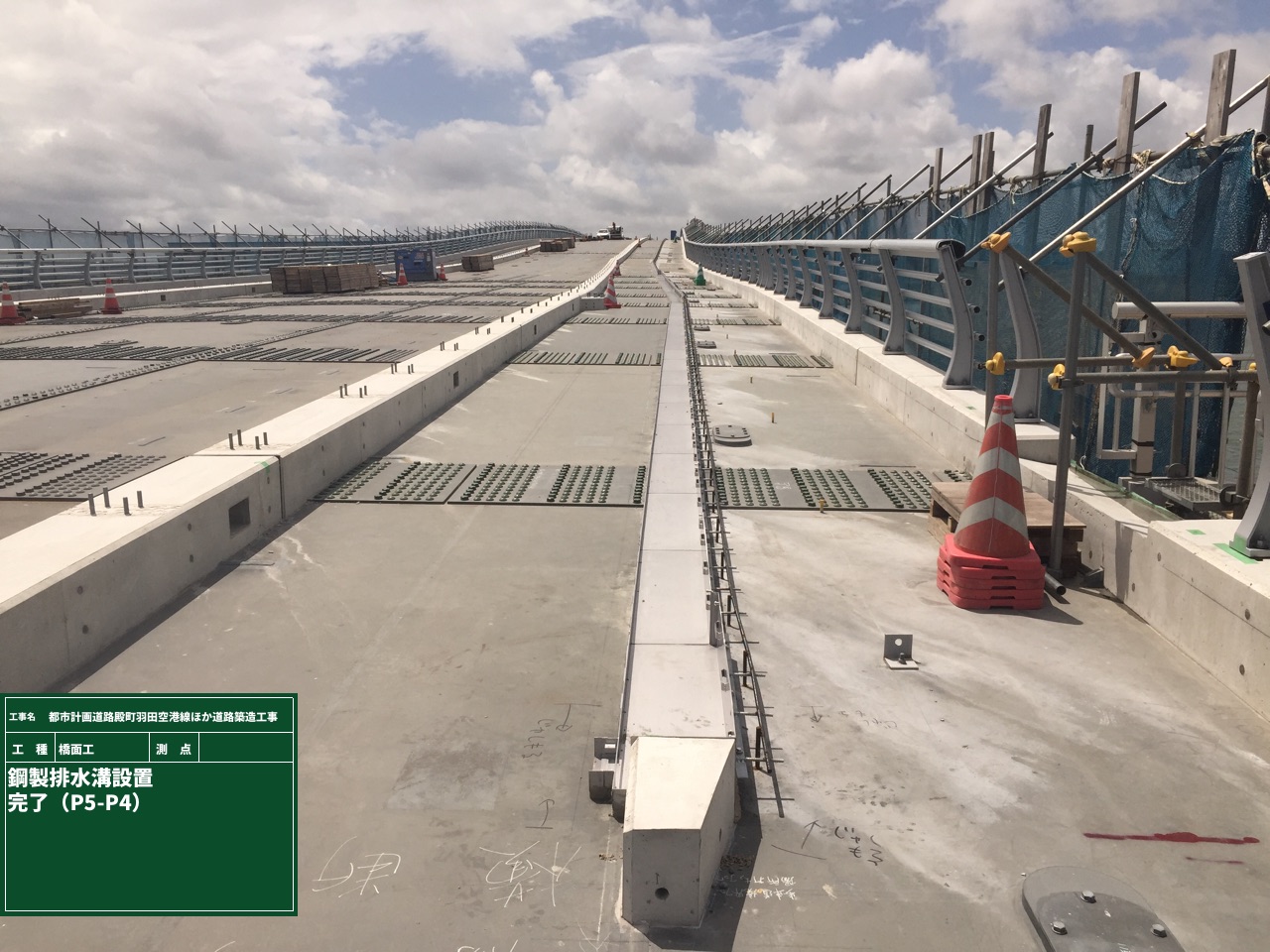 施工は、まず、鋼床版表面をショットブラストで研掃した。投射密度は平均で300kg/m2とした。これは添接部や溶接部が多く、そうした箇所の浮き錆を確実に除去するには、1回打ちではなく、複数回、異なる方向からブラストをかけて確実に施工する必要あるため(錆を確実に除去しなければ舗装のブリスタリングを招きかねない)。その後、カチコートで防水、グースアスファルト基層、次いで表層を全面的に施工した。それと並行して標識柱や車両用防護柵を施工した。