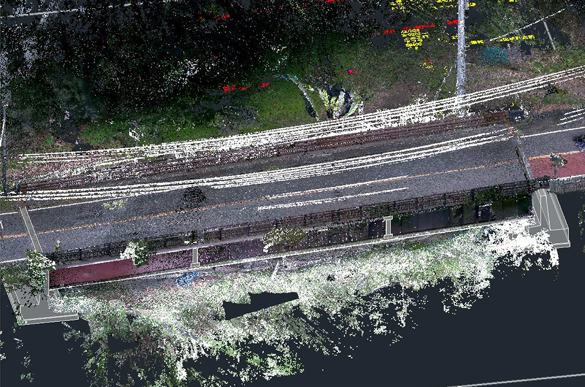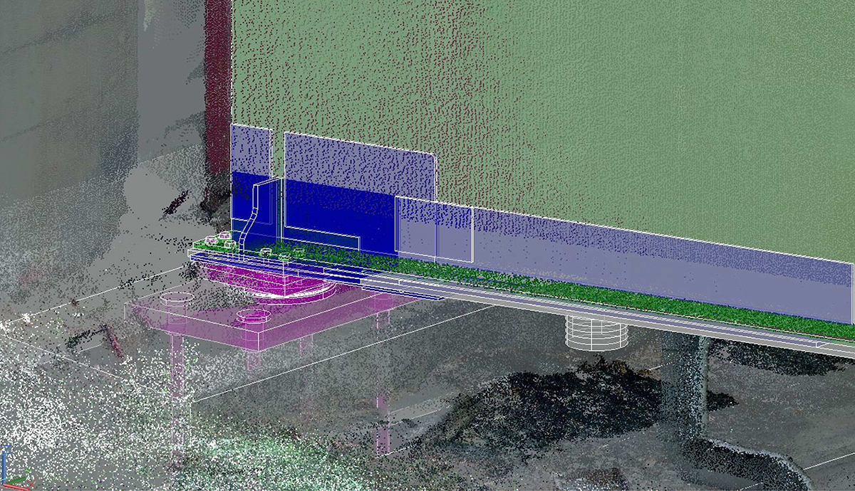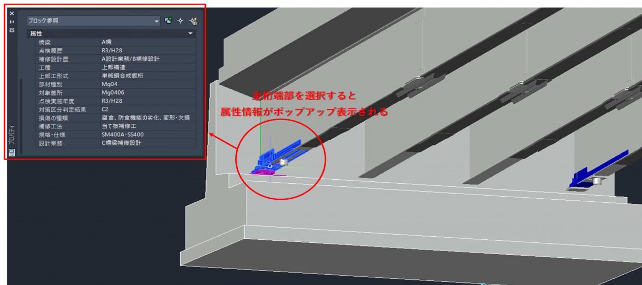 補修が必要な多くの橋梁は、供用後かなりの年数が経過しており、しゅん功図面が残っていない場合が多い。復元図作成のために従来行っていた手作業による計測に代えて、3Dスキャナを活用して「実際の形状・寸法、支障物、施工スペース等の状況をありのままに3D化する」(同社)。既設部材は、現地で取得した詳細な点群データにより3Dモデリング化し、別途CADで作成した主要部材の3Dモデルと合成して、既設構造物データを完成させる。この既設構造物データには、定期点検結果や詳細調査結果から、損傷に関する情報(コンクリートの劣化状況、鋼材の腐食状況と過去の診断結果、対象部材番号、点検年度など)を属性情報として入力した。新規に設計した支承や当て板用の鋼材についてもCADでモデリングし、既設構造物データと重ね合わせ、補修・補強後の完成形を3Dモデリング化して設計に活用した。このような手法を取ることで、設計課題が可視化され、設計の手戻りが無くなるとともに、取り合いが可視化されるため施工の精度も確保できる。