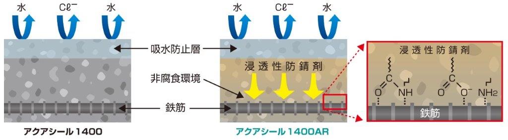 大同塗料は、橋梁などコンクリート構造物分野における鉄筋腐食抑制型ジェル状シラン・シロキサン系表面含浸材『アクアシール1400AR(アンチラスト)』(以下、『AR』)を1日から発売する(上部写真は促進試験67サイクル後の鉄筋腐食状況)。同社が展開しているアクアシール1400に気化性を有する浸透性防錆材を配合したもの。施工は、アクアシール1400と同様、刷毛、ローラー、吹付による施工が可能で、コンクリート表面を研掃後塗布するだけでよい。放射状に含浸して均等な吸水防止層を形成する特性があるため、多少の塗り斑があっても性能を発揮できる。㎡あたりの塗布量は230gと従来工法の3分の1の塗布量で施工することが可能。また、ジェル状の生成物がコンクリート表面に蓋をすることで、気化性の防錆剤は空気中に抜けることがなく、コンクリート内部へ浸透していき、早期に鉄筋近傍まで到達し、防錆効果を発揮させることが出来る。既設にも適用可能で、既に塩化物イオンが侵入した構造物であっても防錆効果を発揮する。アクアシール1400と同様、コンクリート表面から4~7mmの厚さに吸水防止層を形成し、ARはコンクリート構造物への水の浸入を防ぎ、塩害、凍害、ASRなどを生じさせる劣化因子の侵入を阻止できる。(井手迫瑞樹)