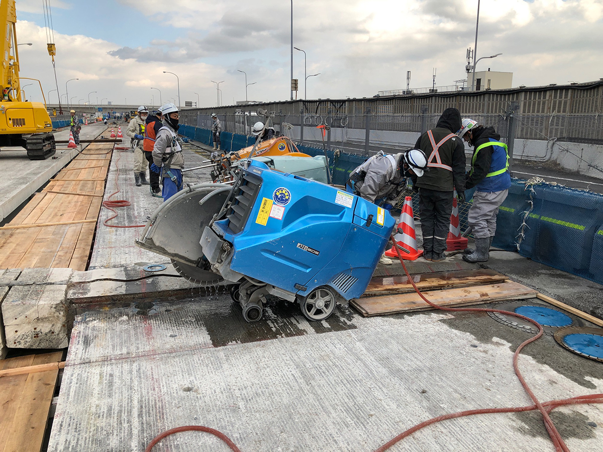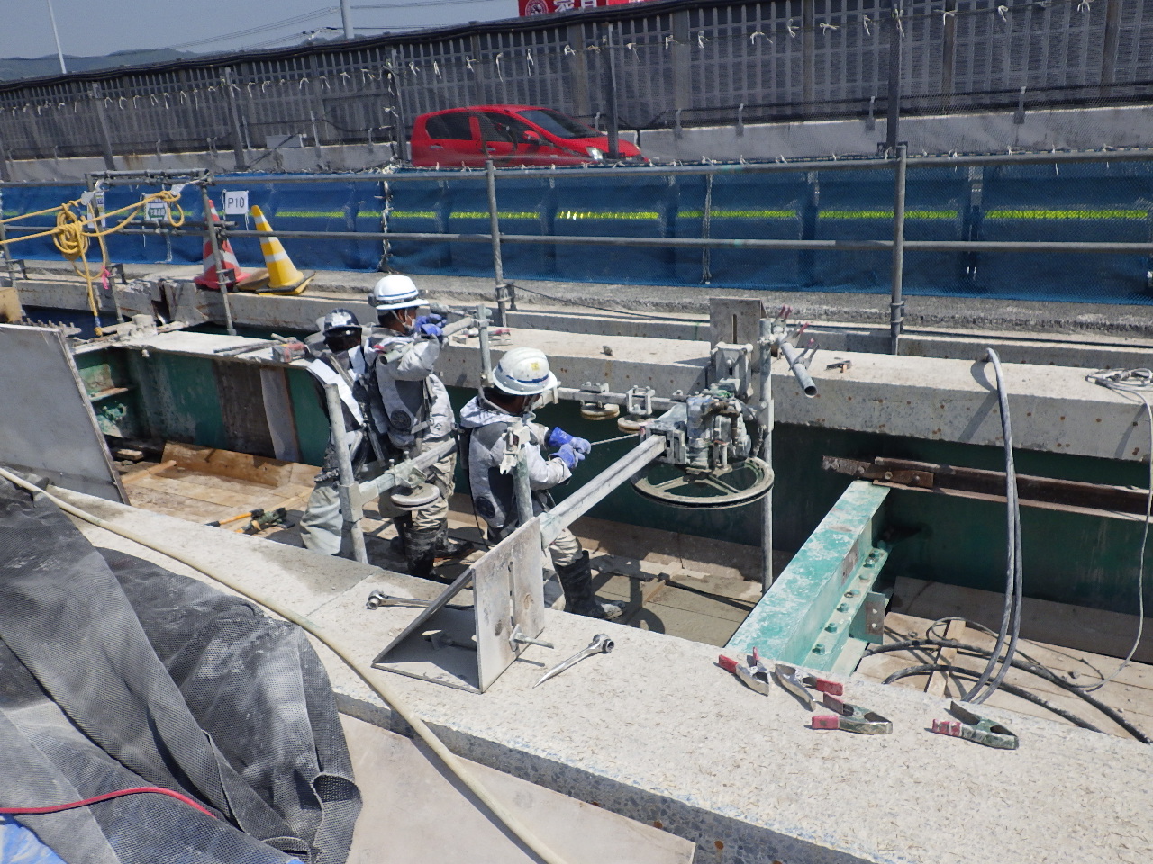 センターホールジャッキを用いた剥離機で床版を剥がし、吊り上げた後、門型架設機の後方に入ったトラックに載せて、場外に搬出する。そして門型架設機を後方にずらした後、次に撤去する床版の上から不要になったレールを撤去(これも門型架設機を活用する)し、主桁間の床版を撤去するということを繰り返していく。床版を撤去した後の桁直上はワイヤーソーによりジベルごと水平切断し、ガラを撤去した後、上フランジ全面をきれいに研掃していく作業を並行して行う。